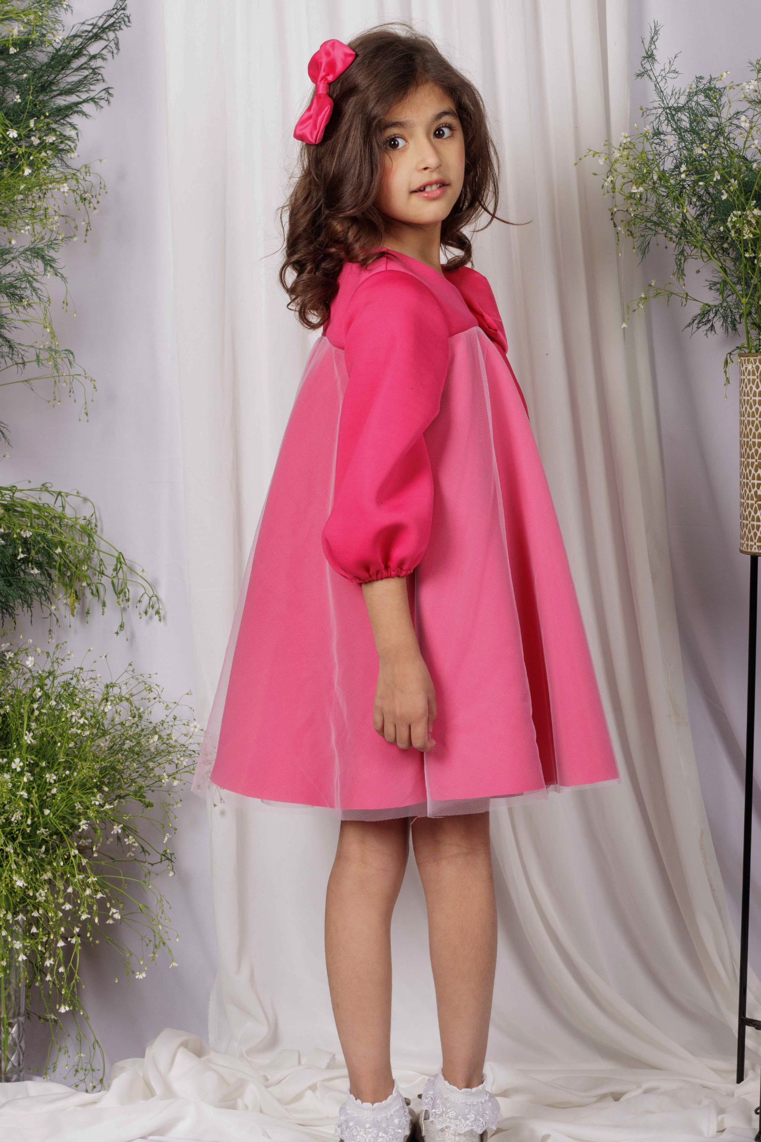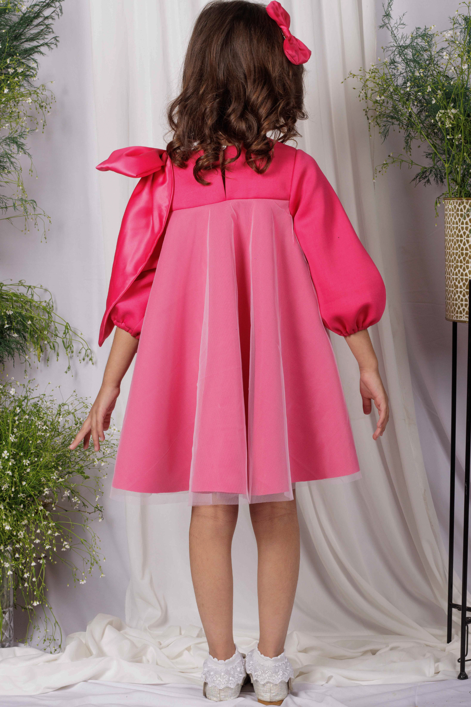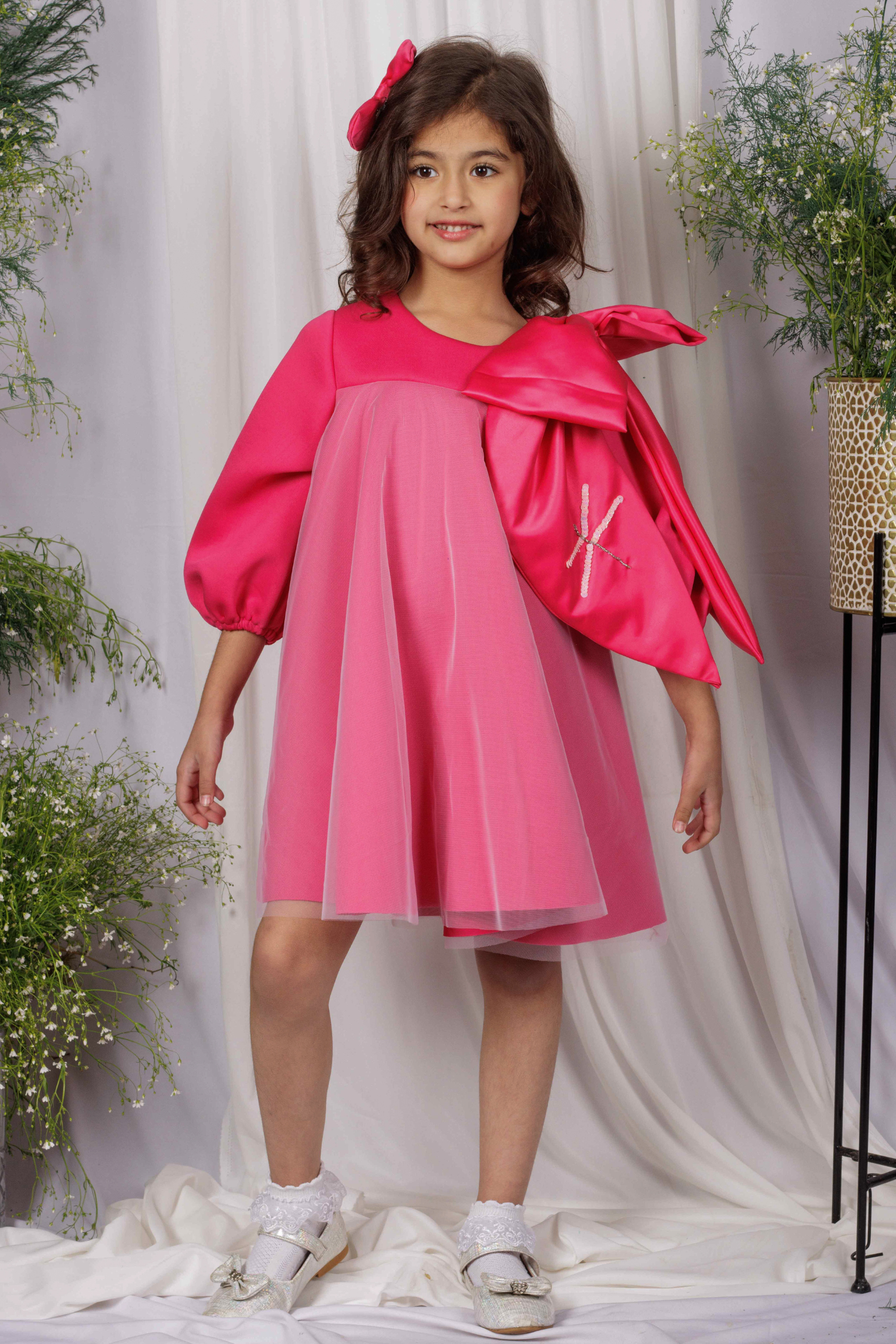 - This pink scuba dress features a gorgeous white net overlay and a statement bow at the shoulder.