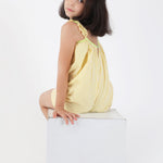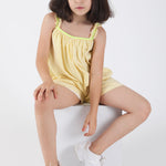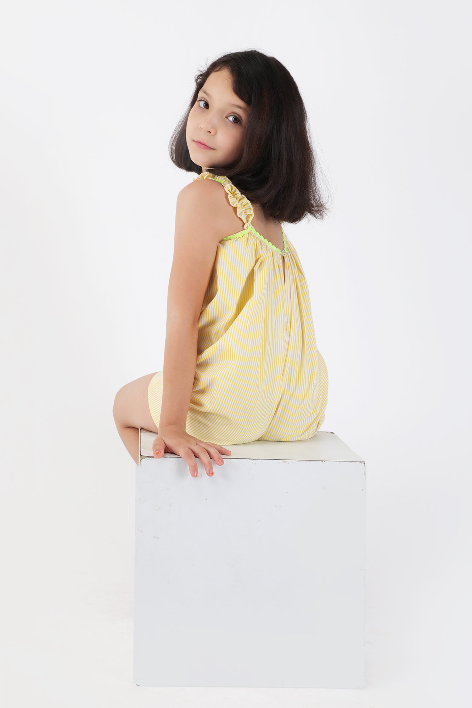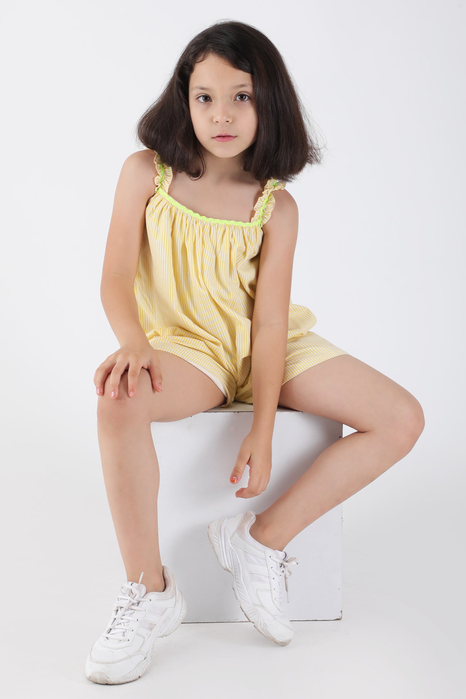 This playsuit features elegant yellow and white stripes, complemented by delicate frilly shoulder straps and subtle neon piping along the neckline, creating a refined yet playful look.