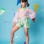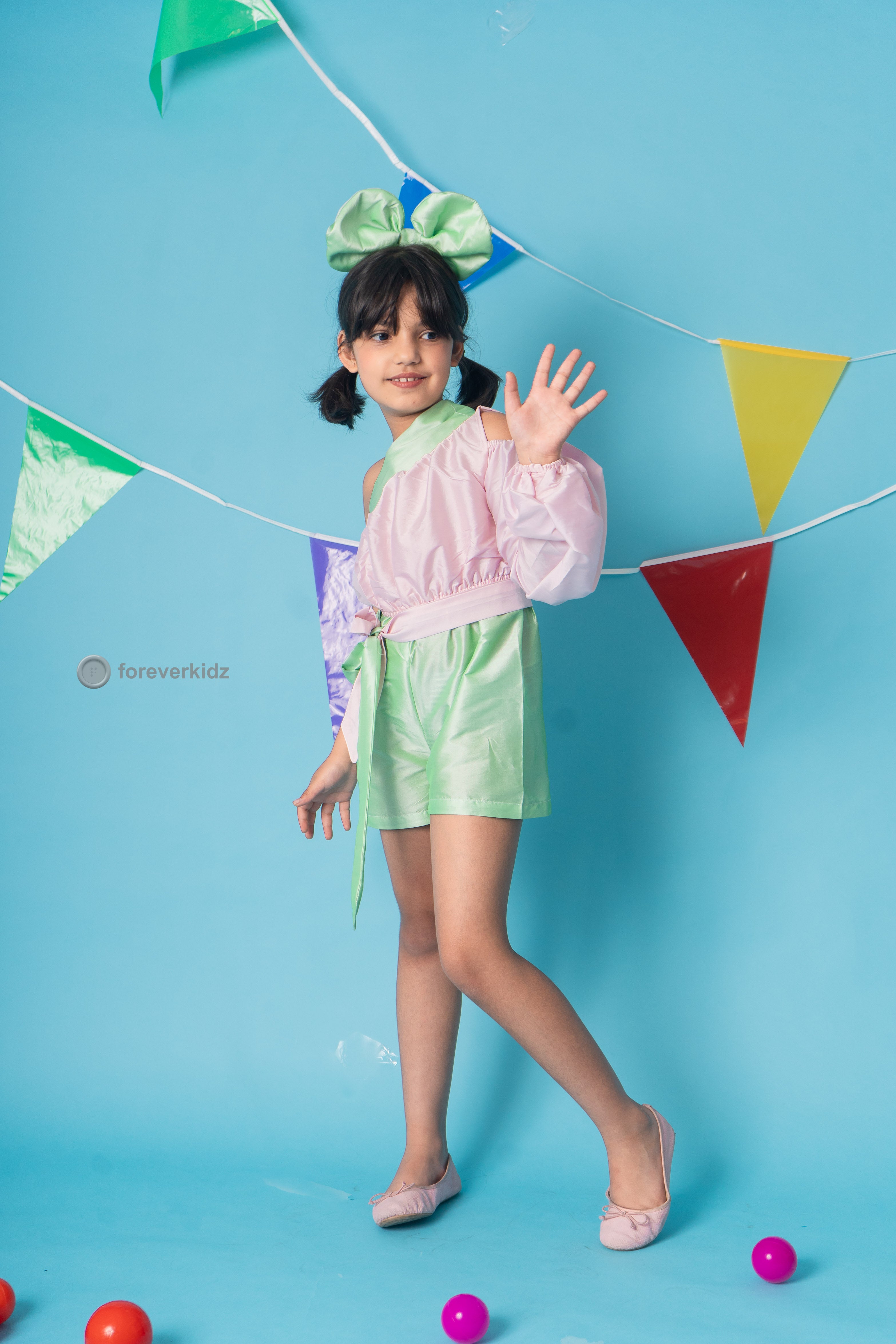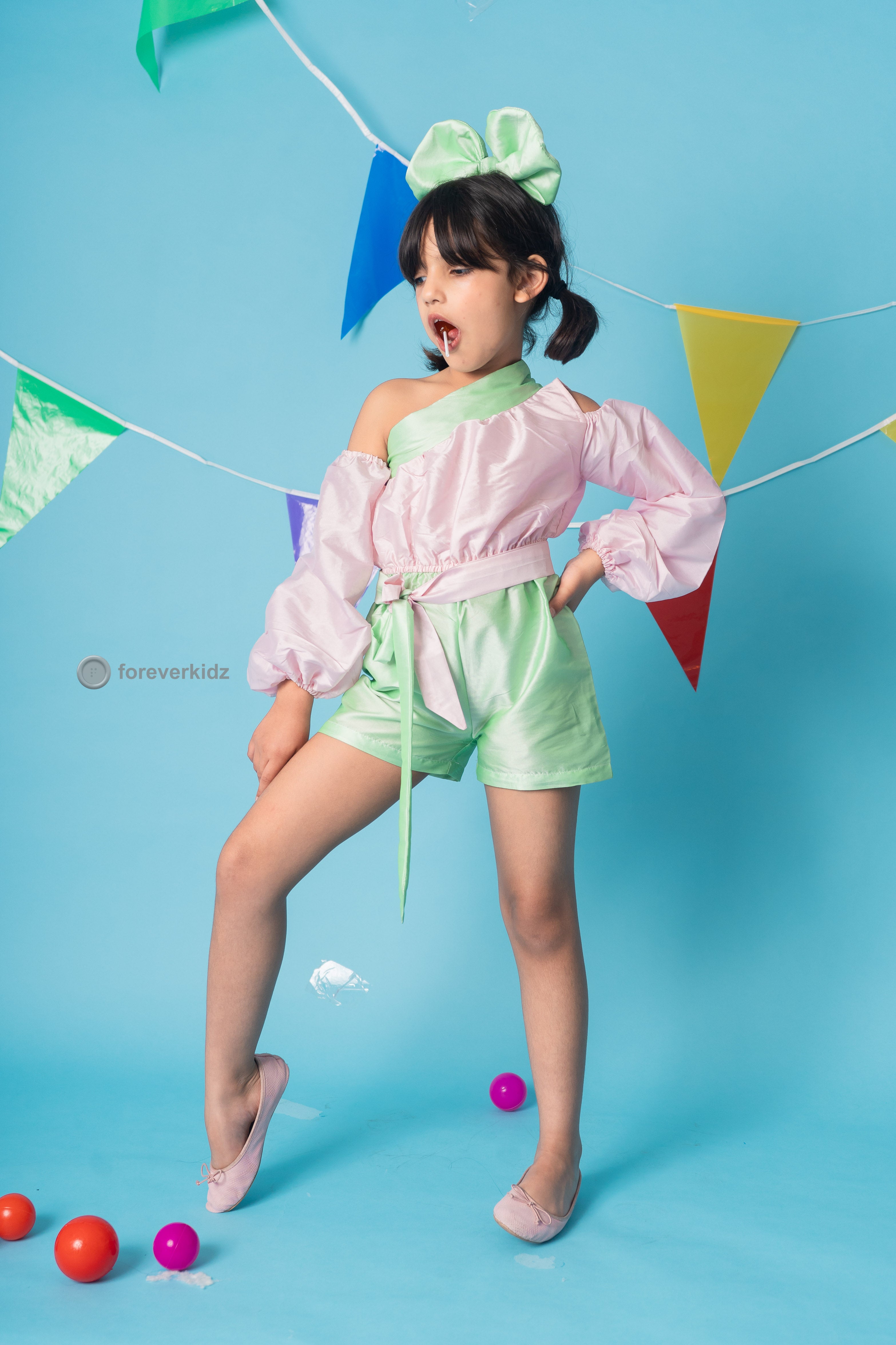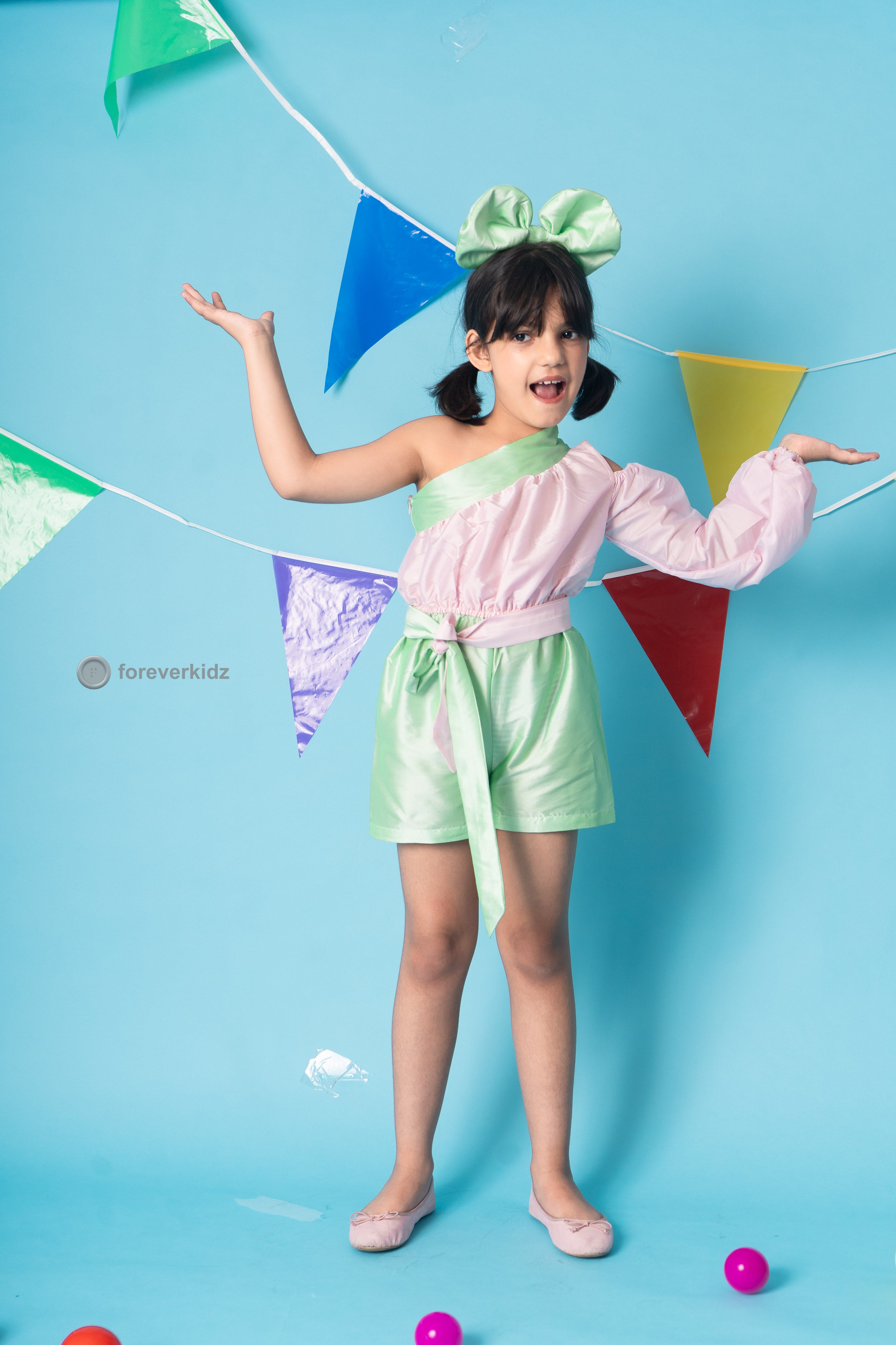 - Candy theme party wear and perfect for Sunday brunch party dressing, your daughter is absolutely going to look super gorgeous in this candy playsuit with detachable sleeve.