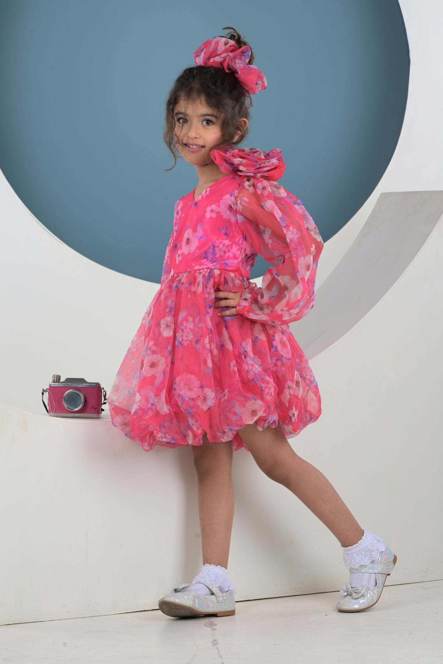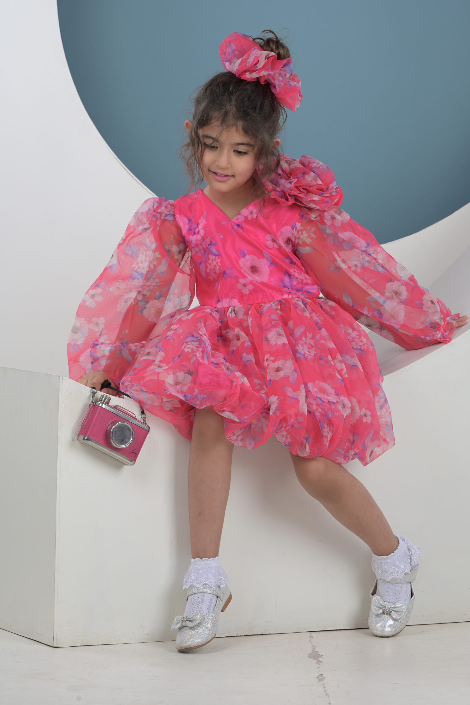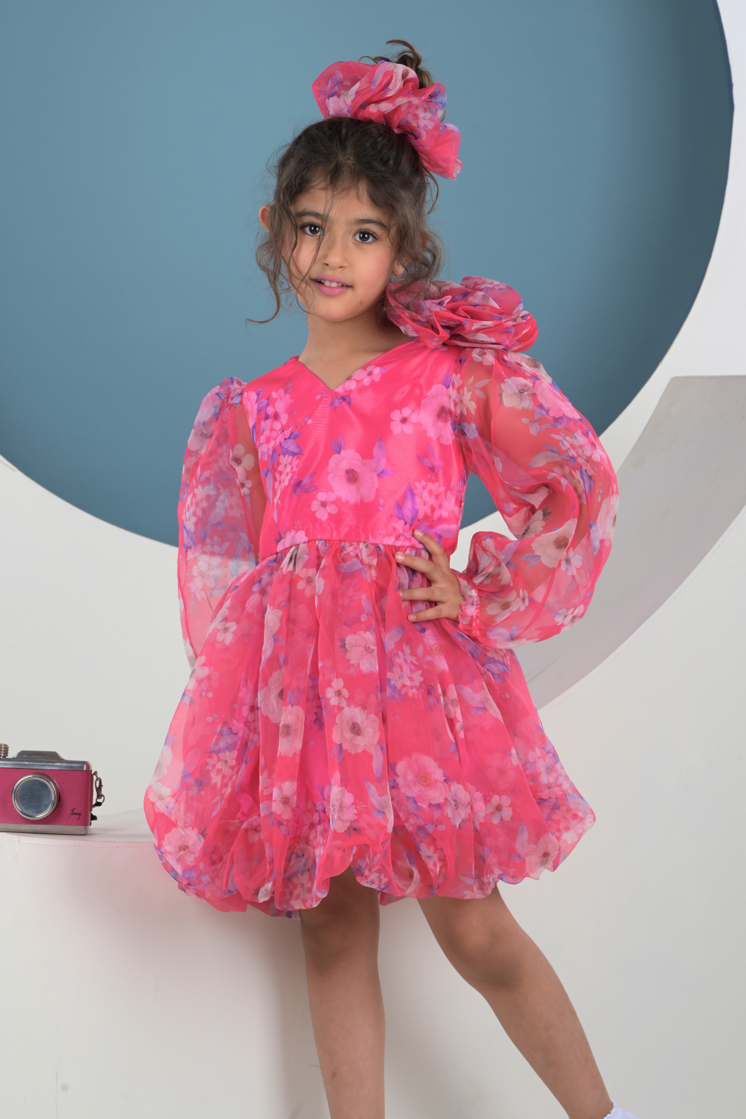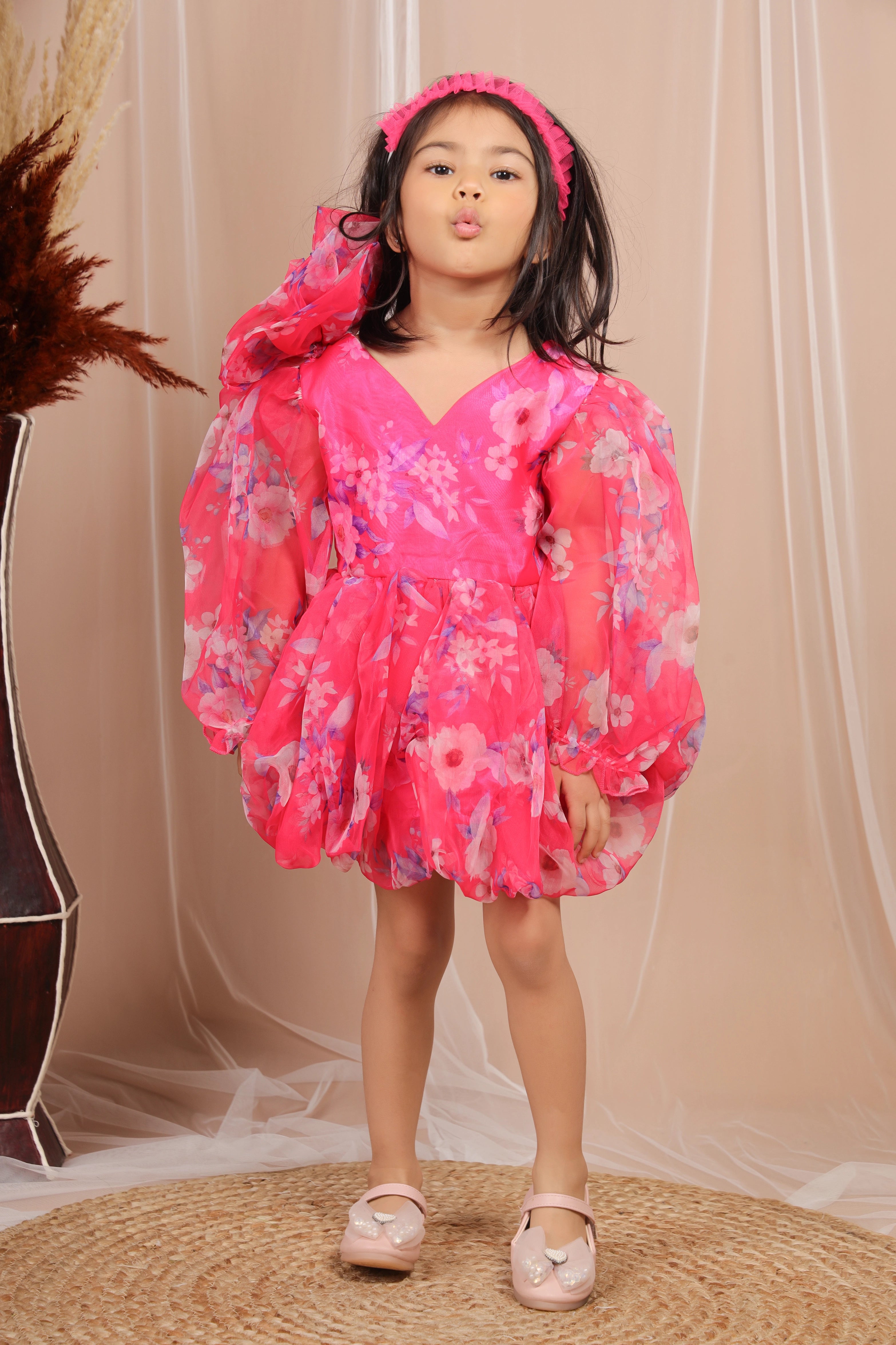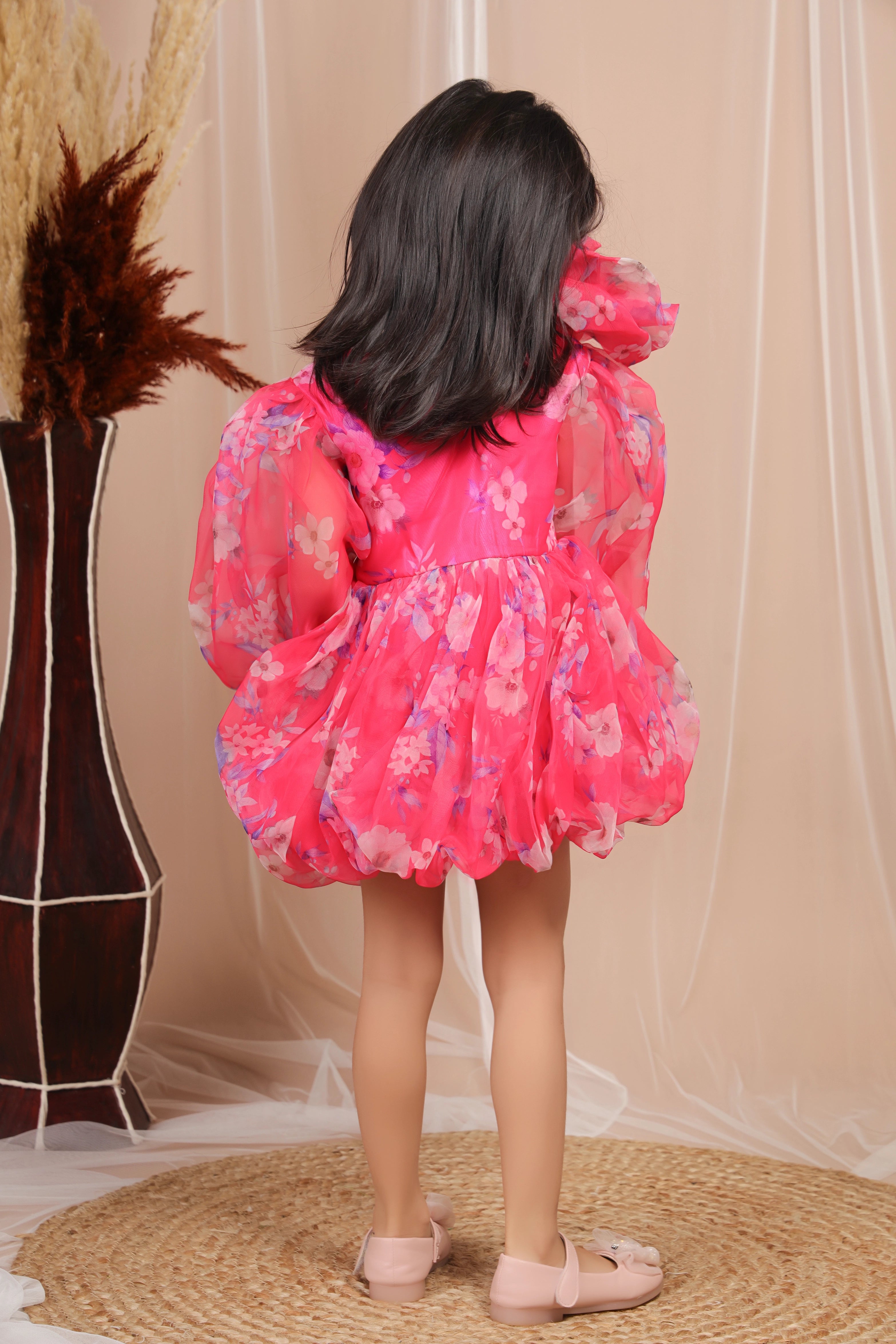 - These hot pink floral prints on organza makes this pretty balloon party dress a closet must-have.