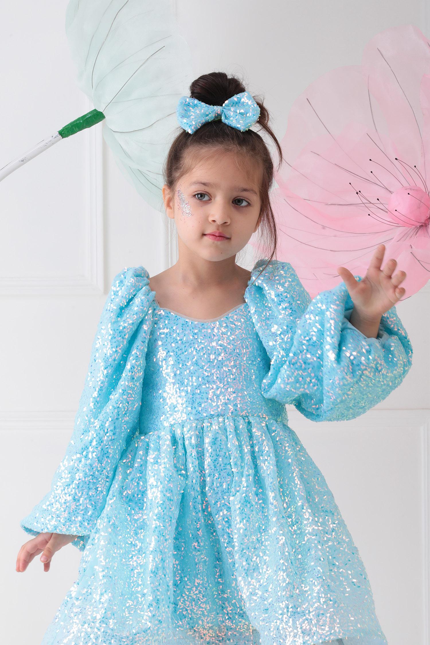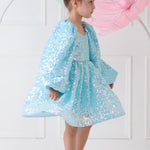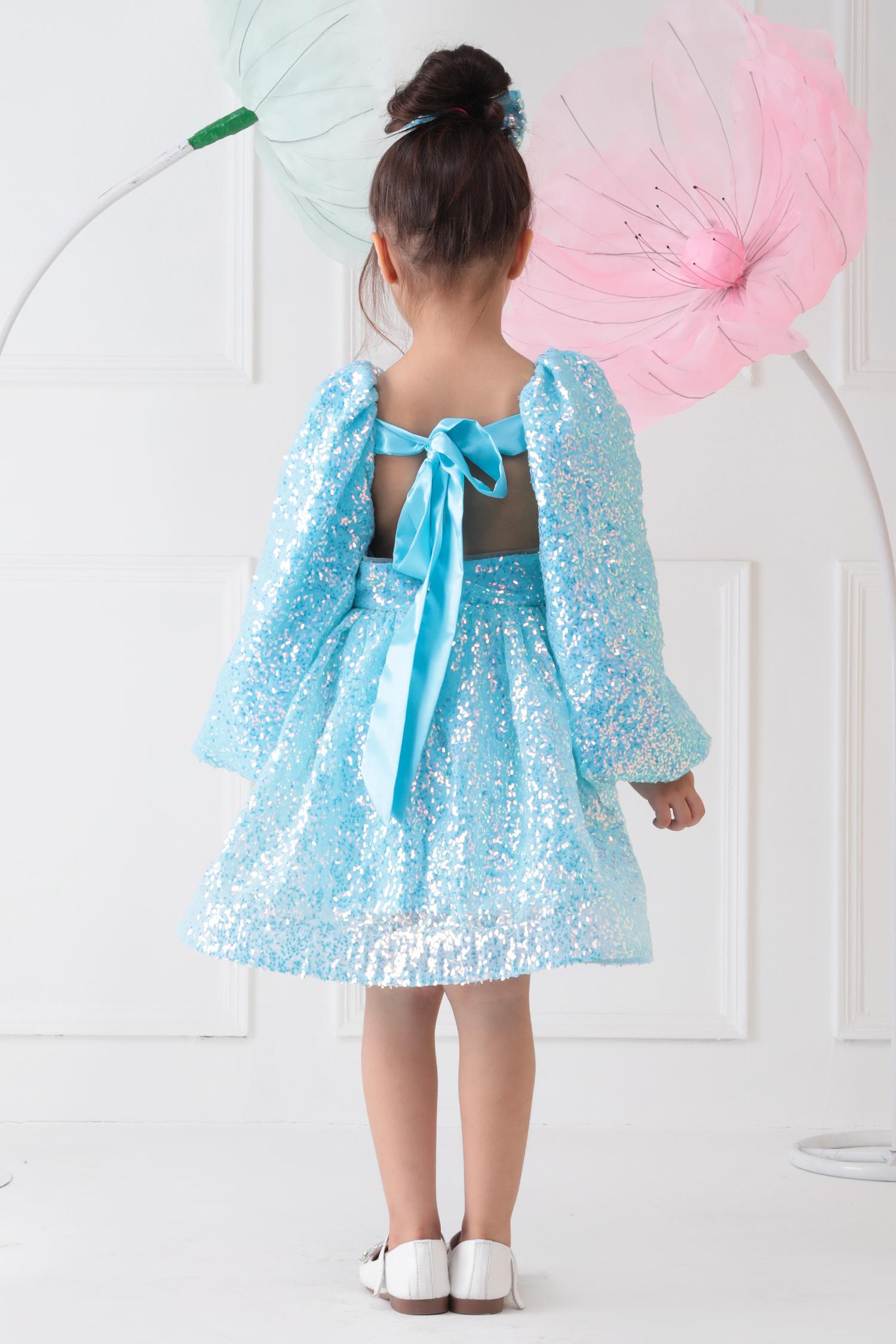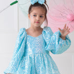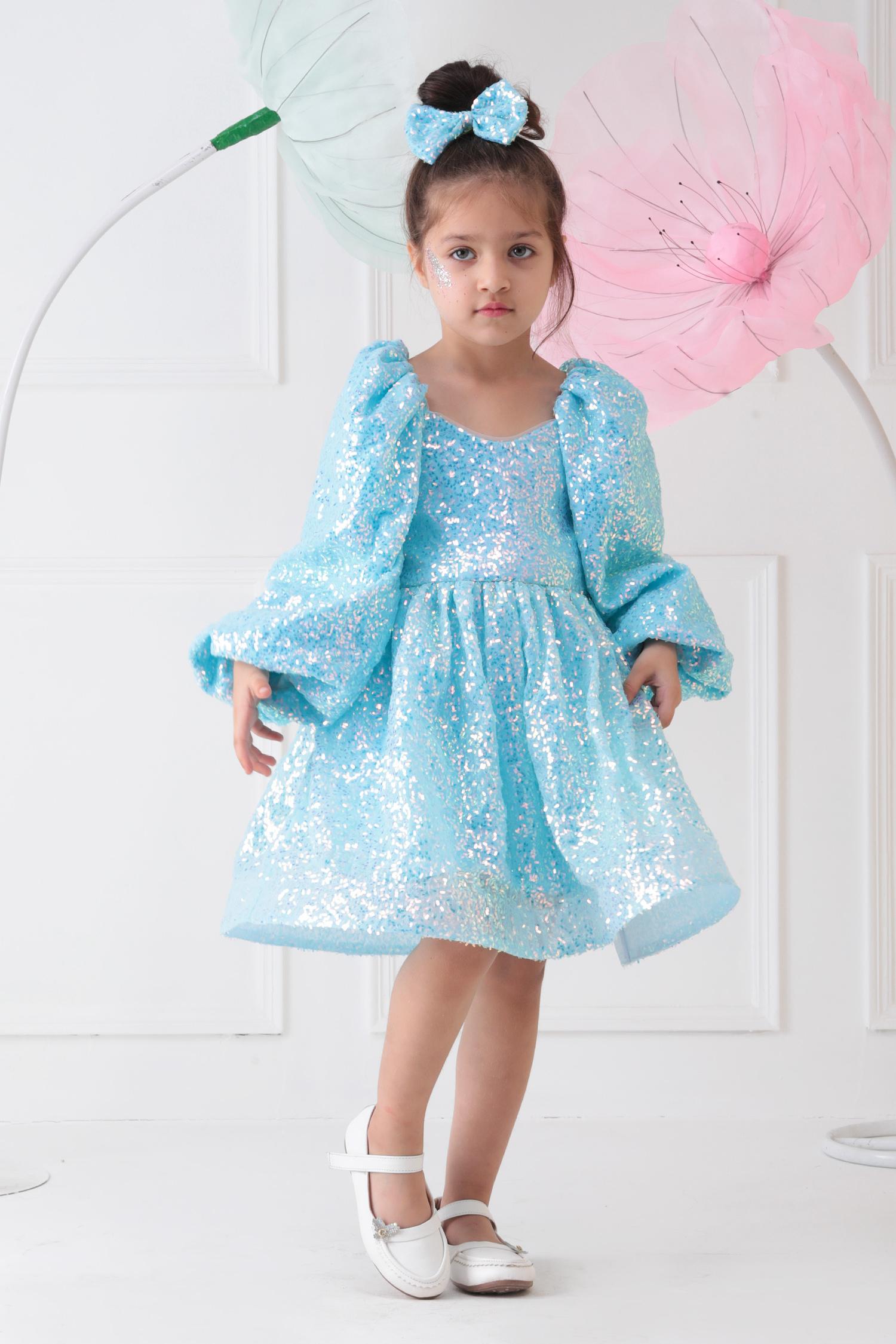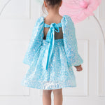 Indulge your little one in pure elegance with our Aqua Shine Back Bow Joy Frock.
