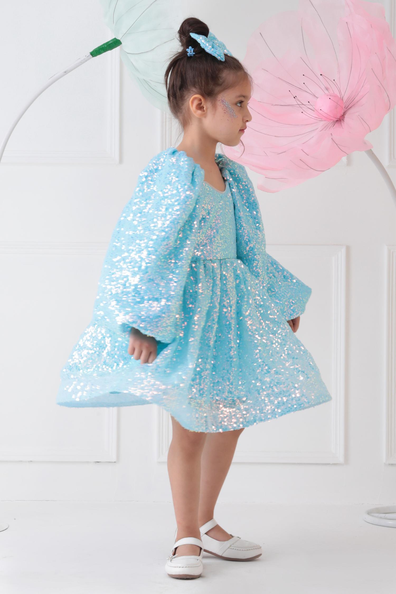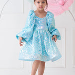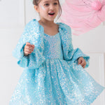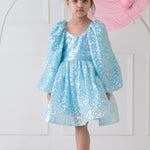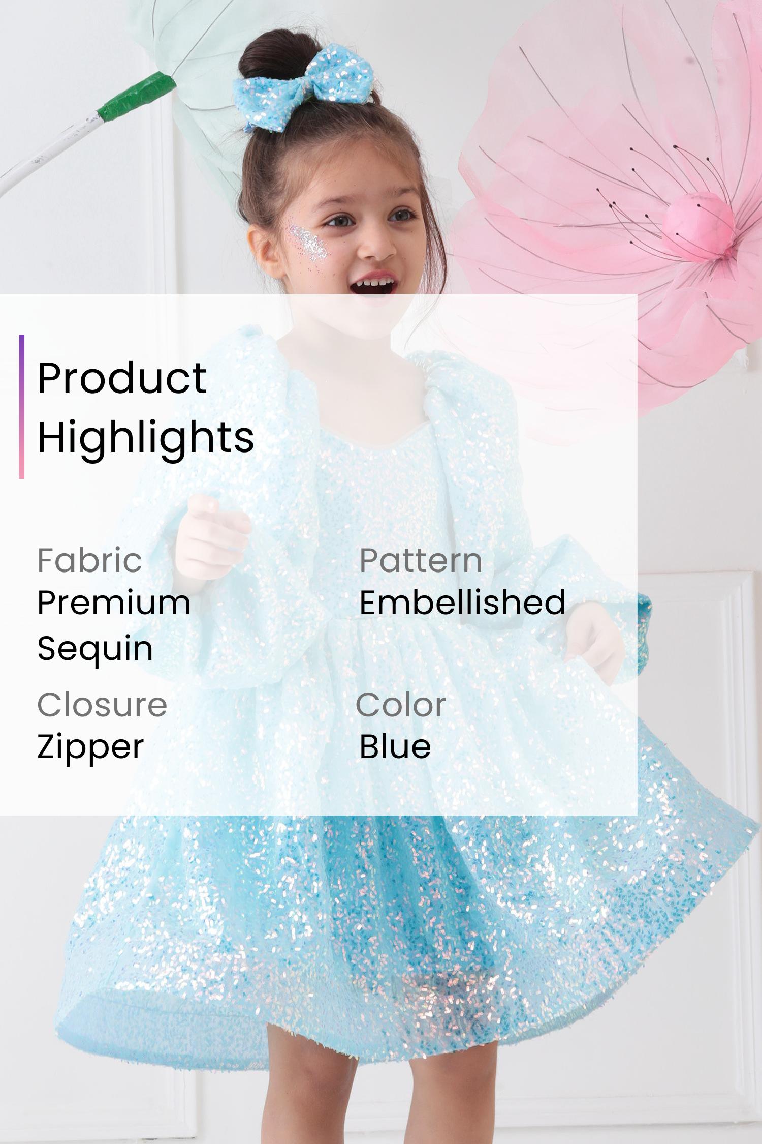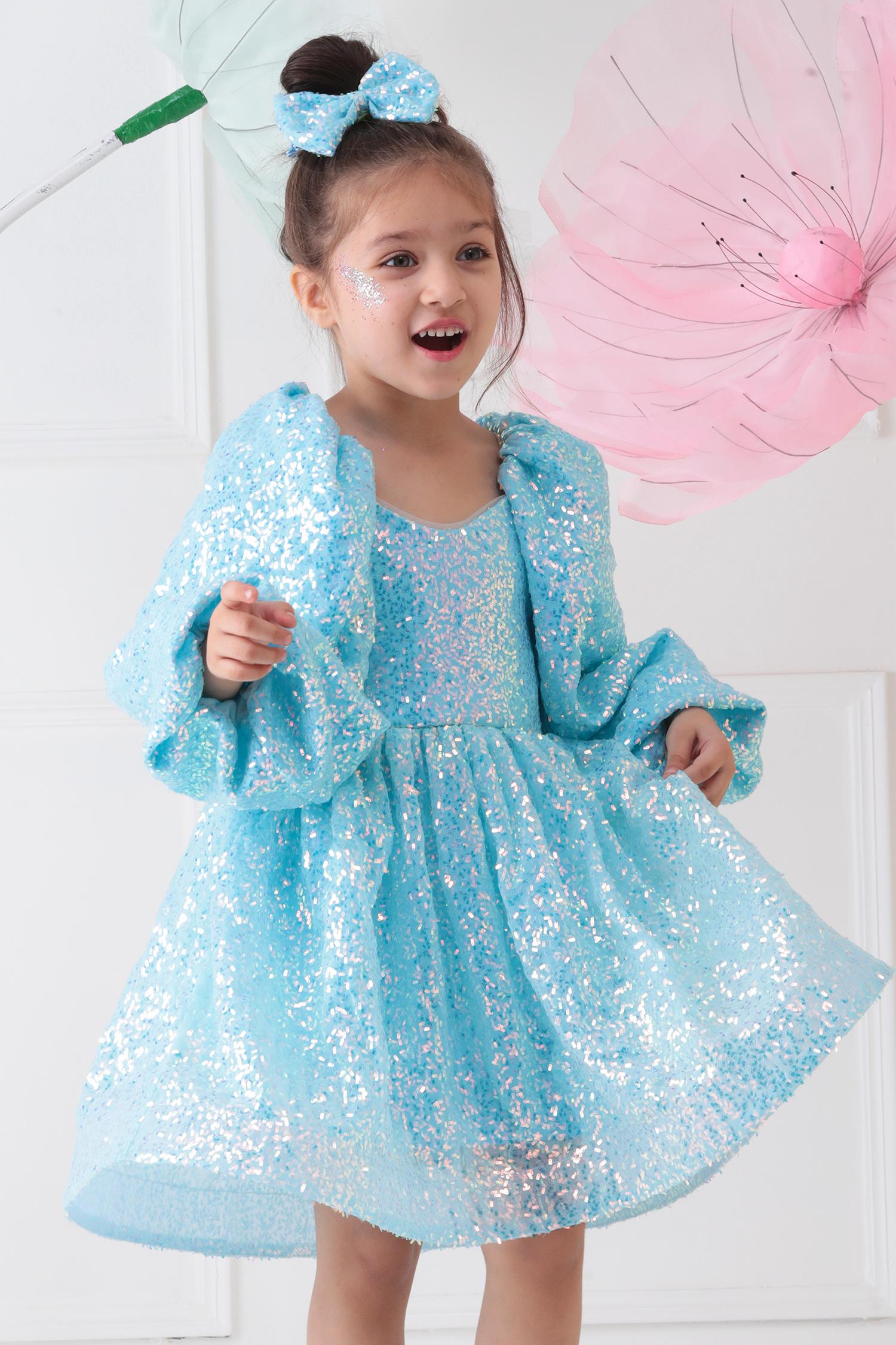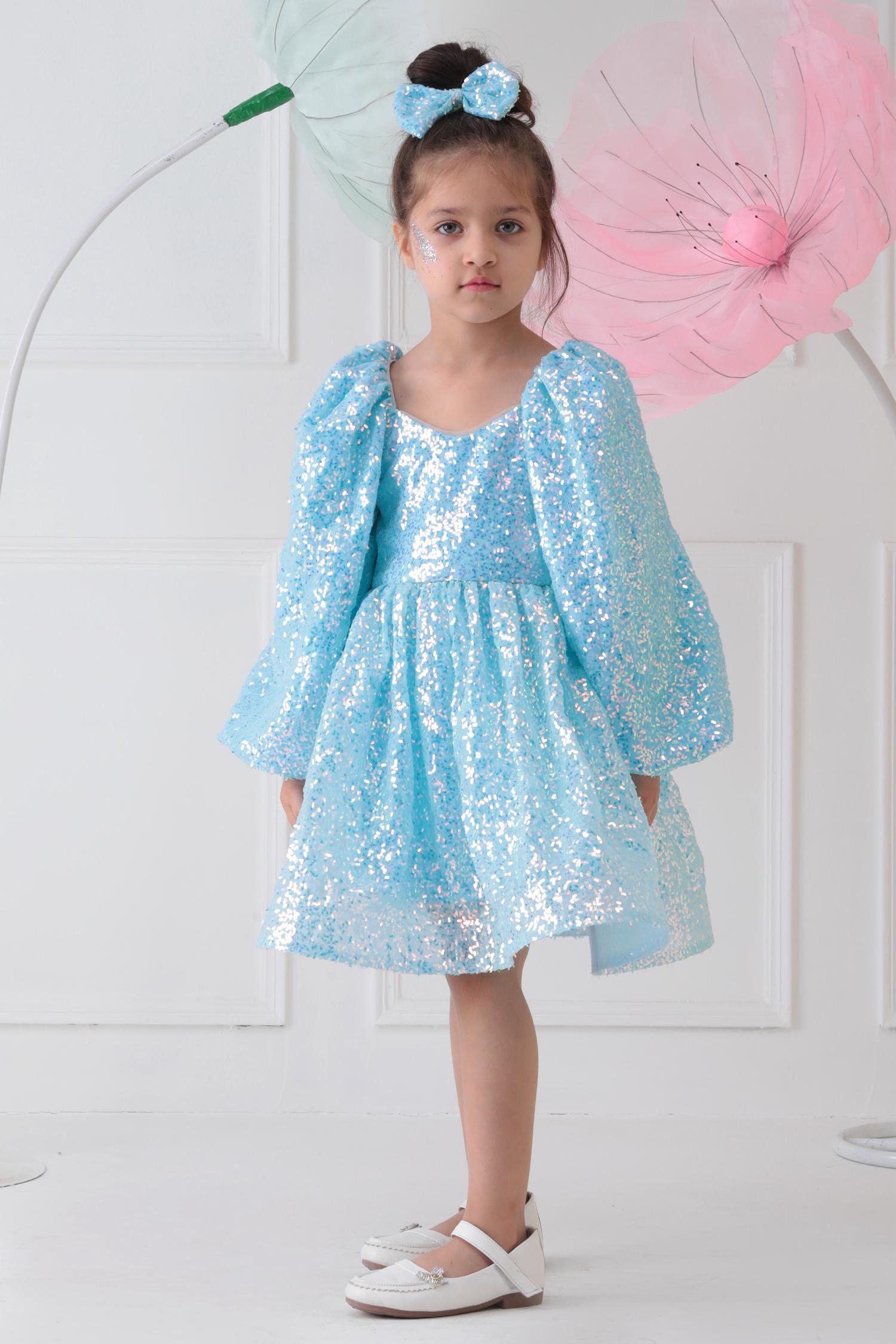 Indulge your little one in pure elegance with our Aqua Shine Back Bow Joy Frock.