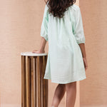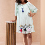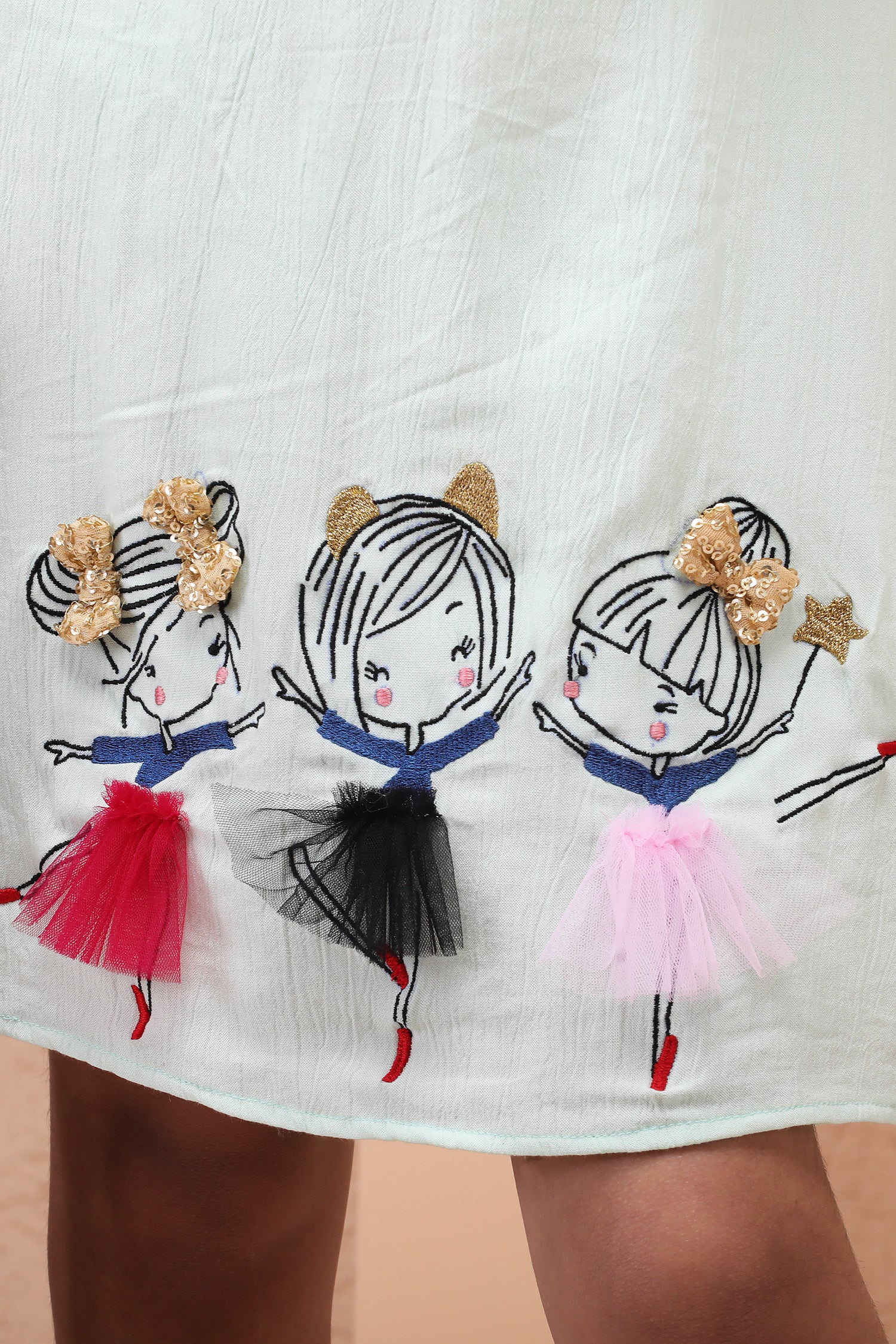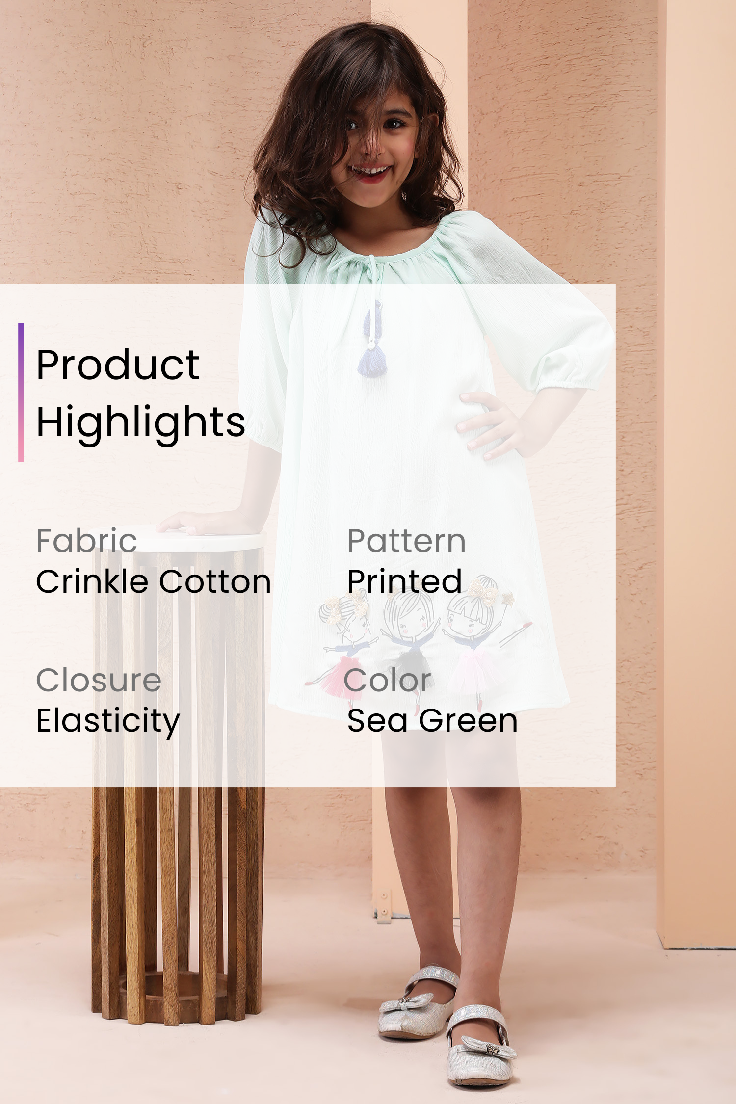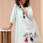 With dancing dolls all over and a sea green hue, this dress is sure to make you stand out.