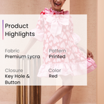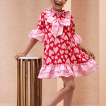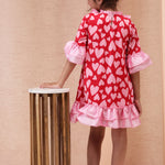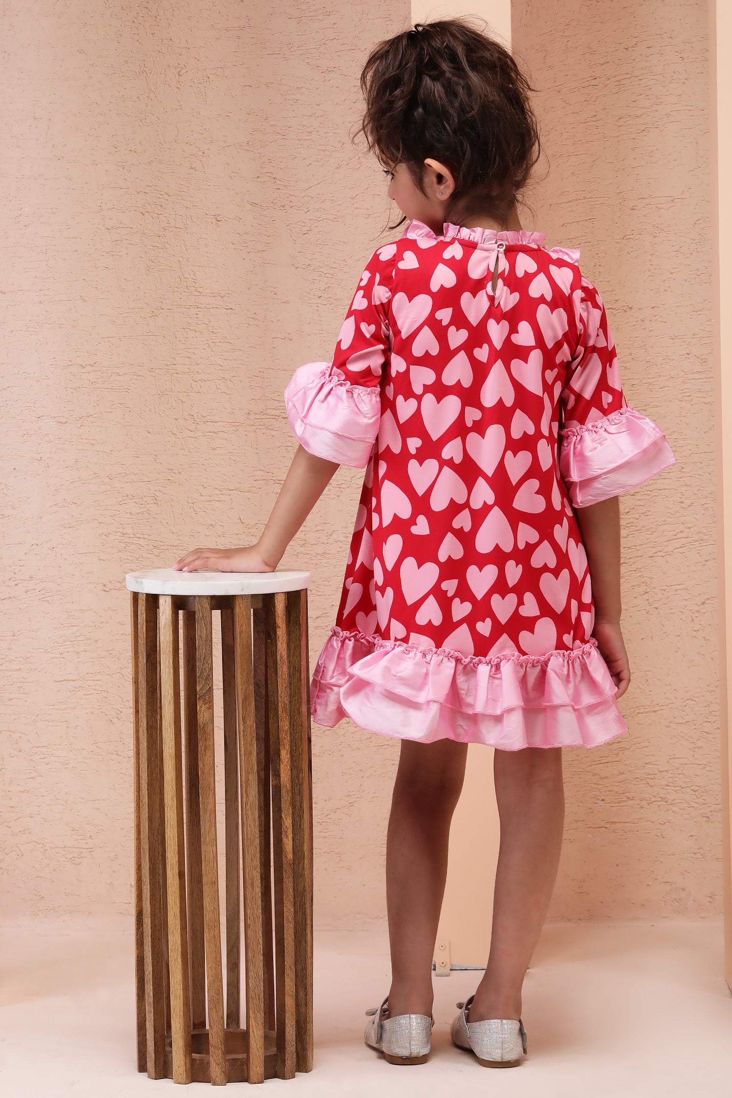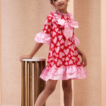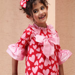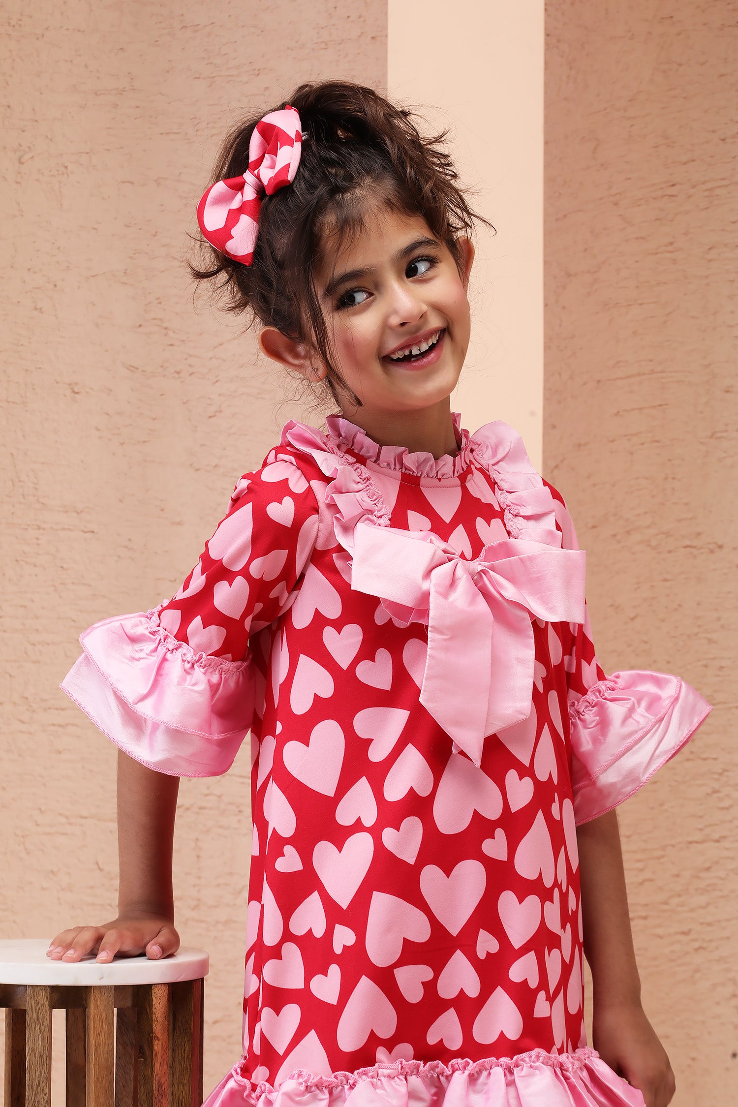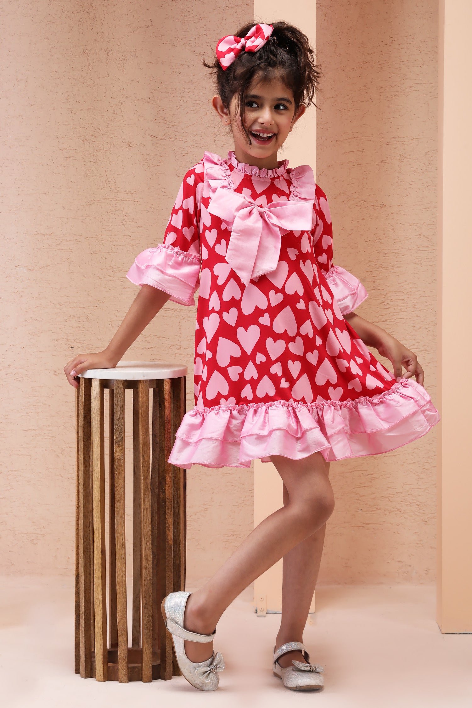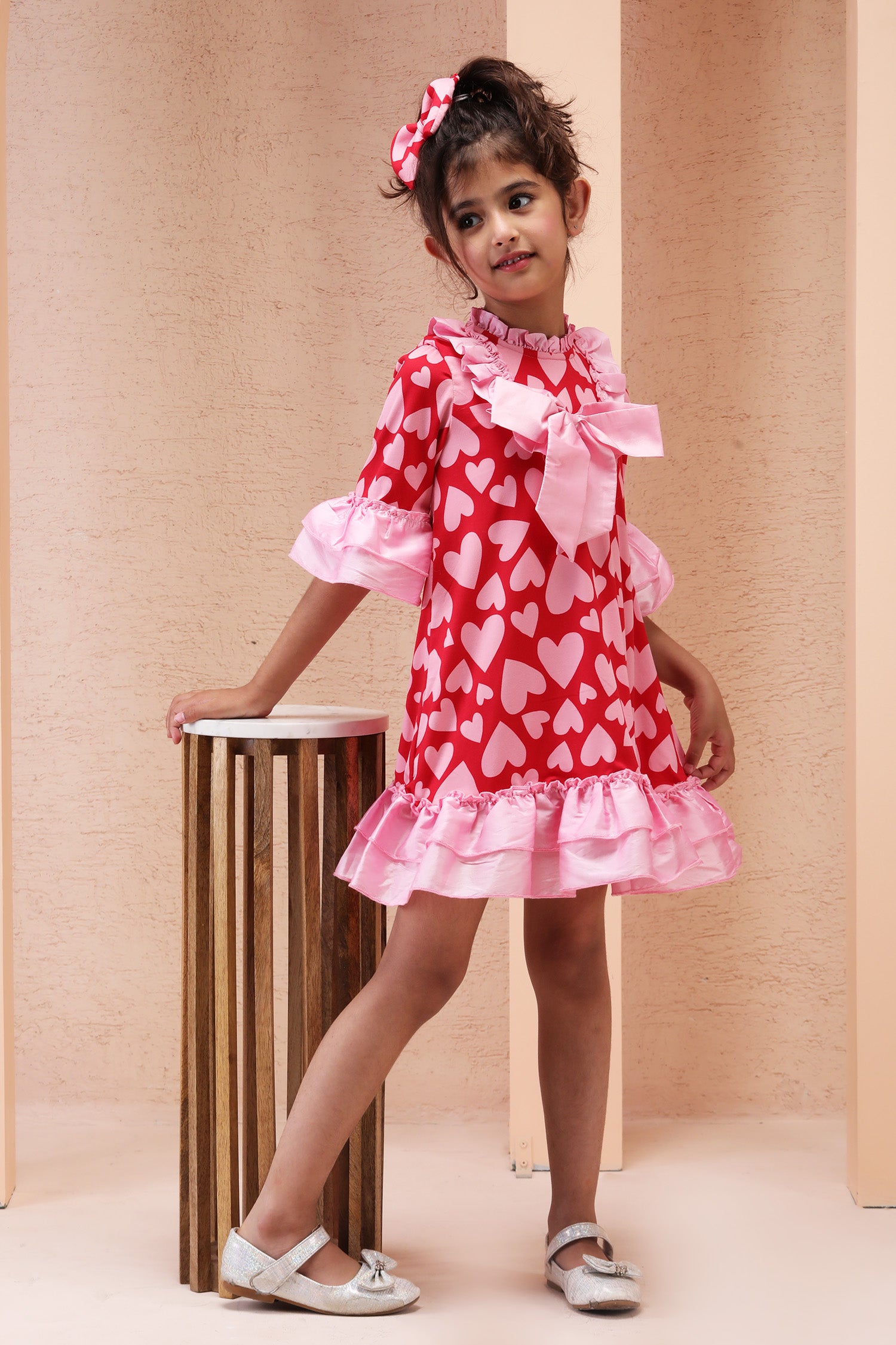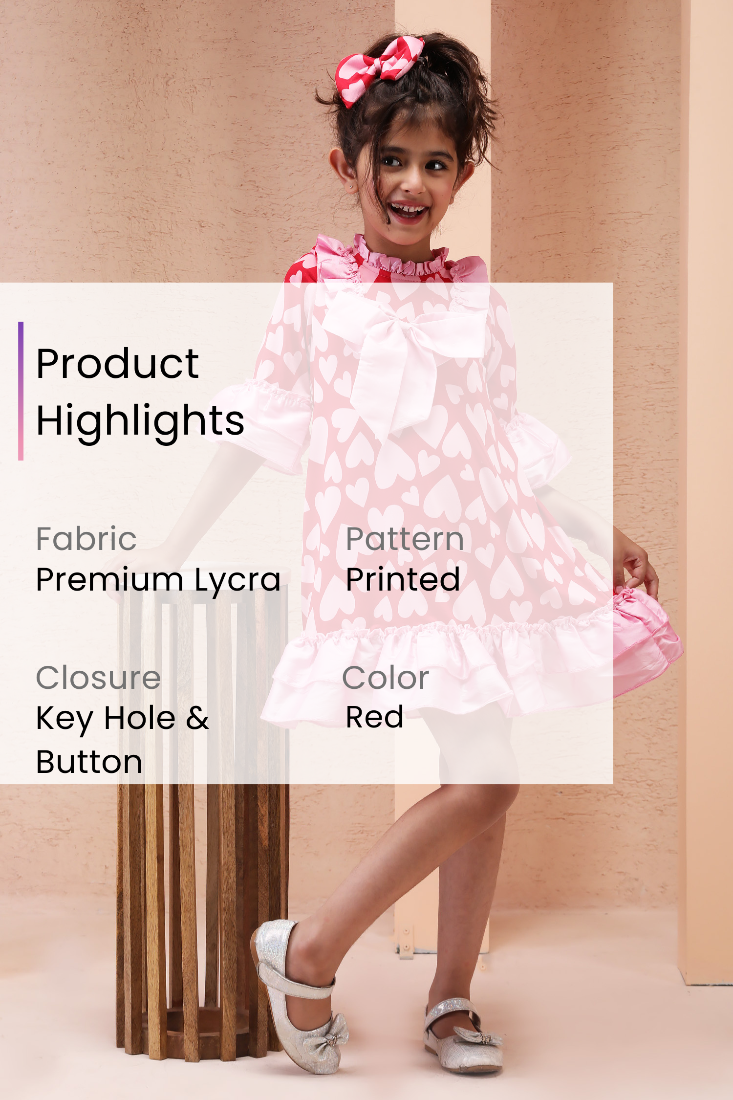Made from premium fabric, this dress features playful heart-shaped, frills on the sleeves and a cute pink bow in the front.