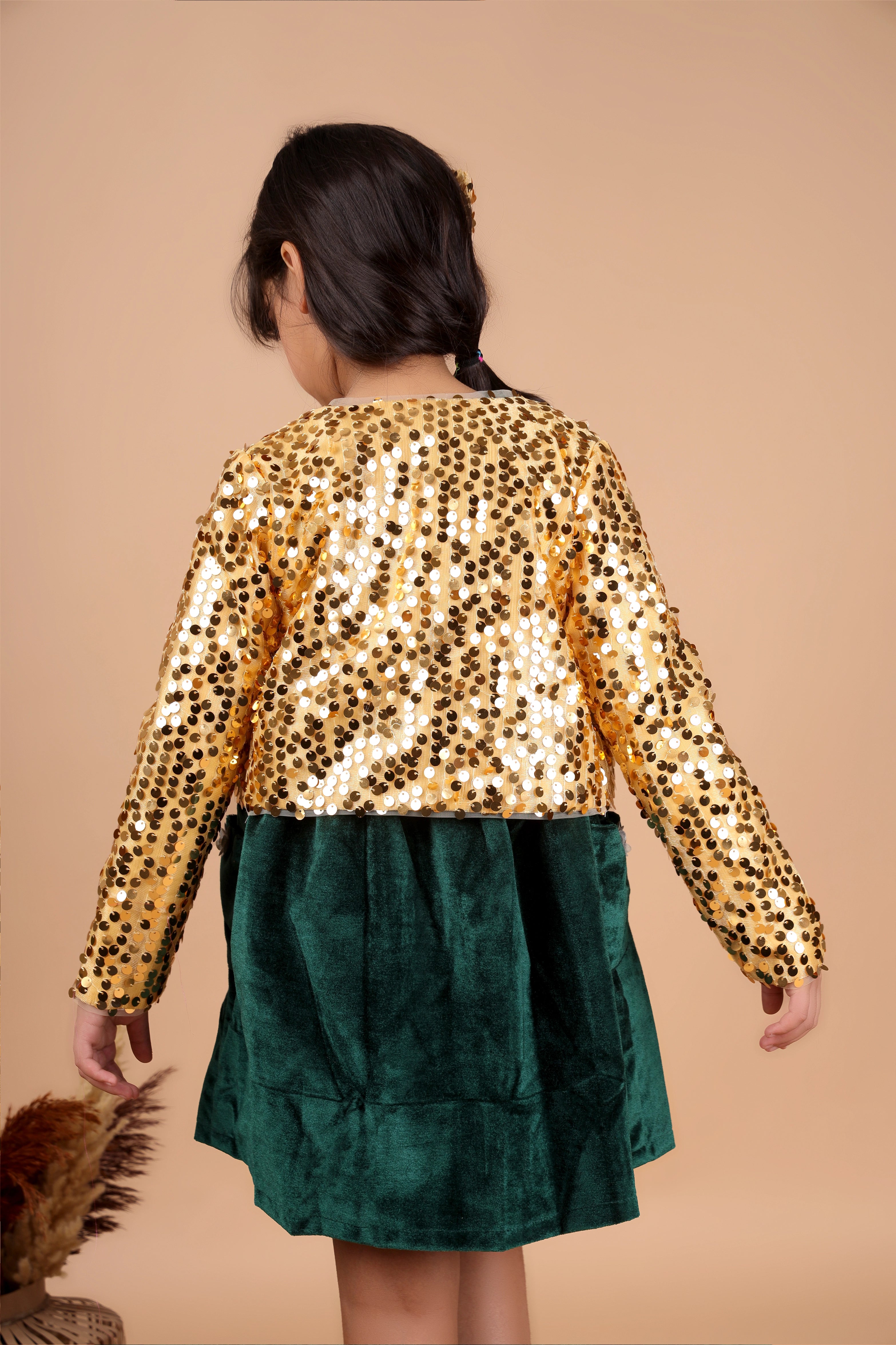 Add a pinch of glitz and glam to your little girl's party look with this golden sequin shrug. Let her sparkle in style, even during cooler months. Make a Sparkly statement with this gorgeous, flashy shurg!