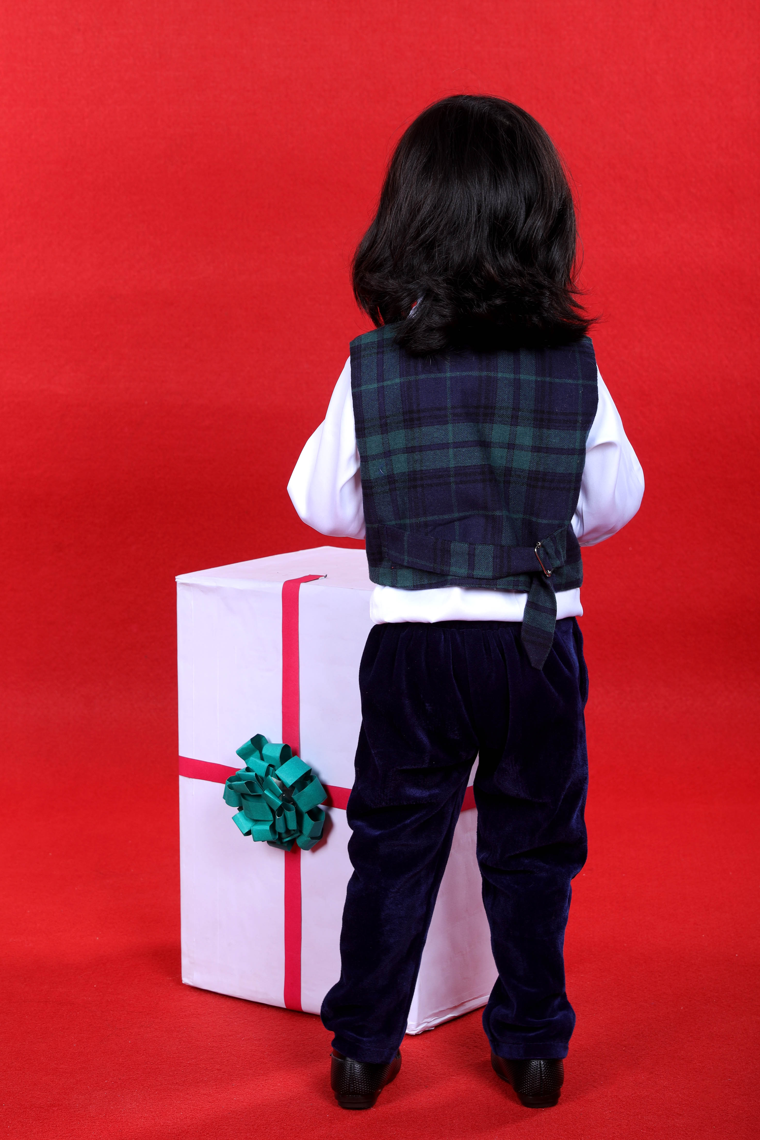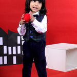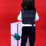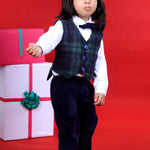 - Check pants paired with white shirt , waist coat and matching bow tie for lil handsome boy to rock his party look!