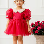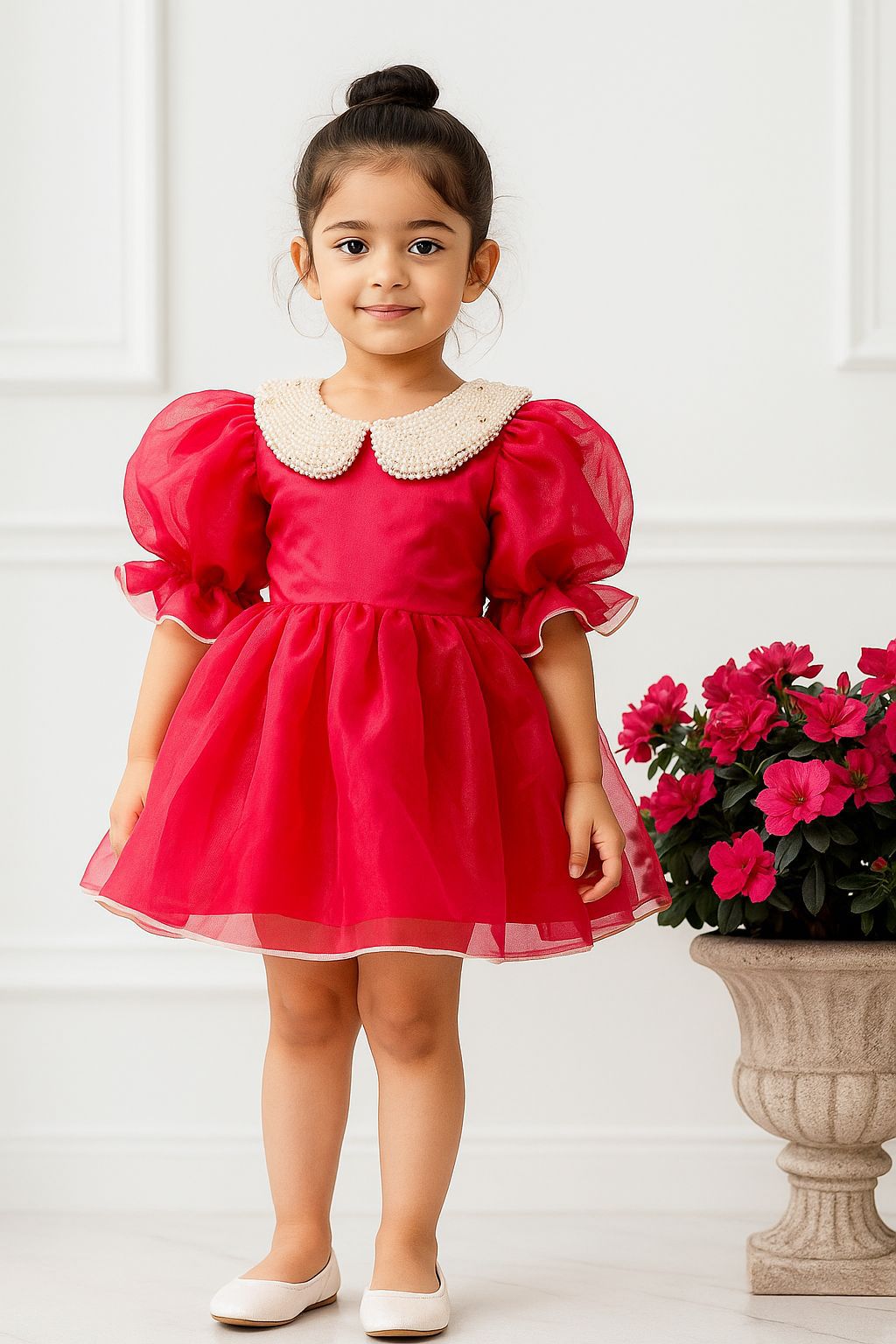 Adorned with delicate pearl handiwork on the collars and charming puffy sleeves.