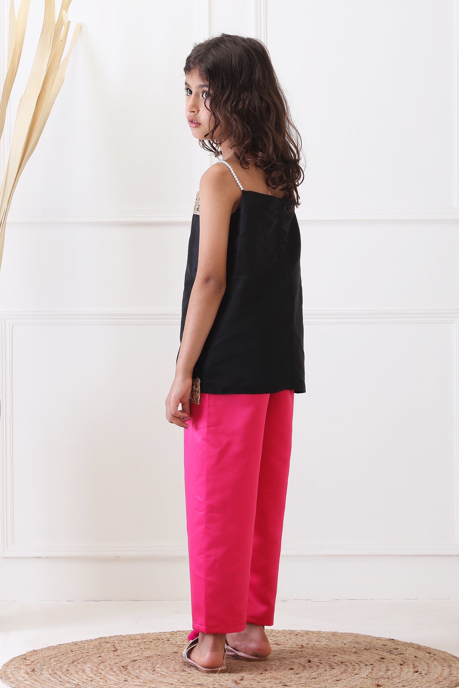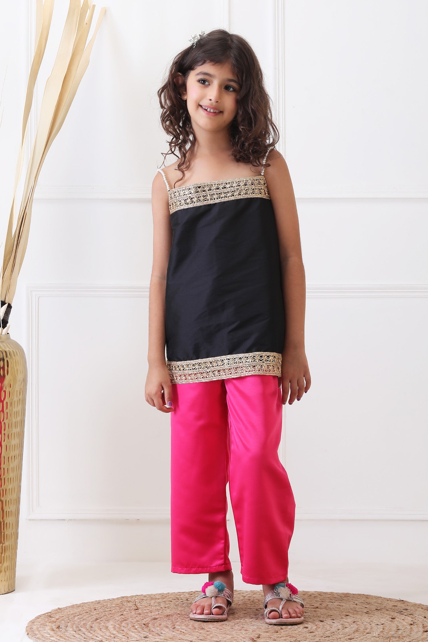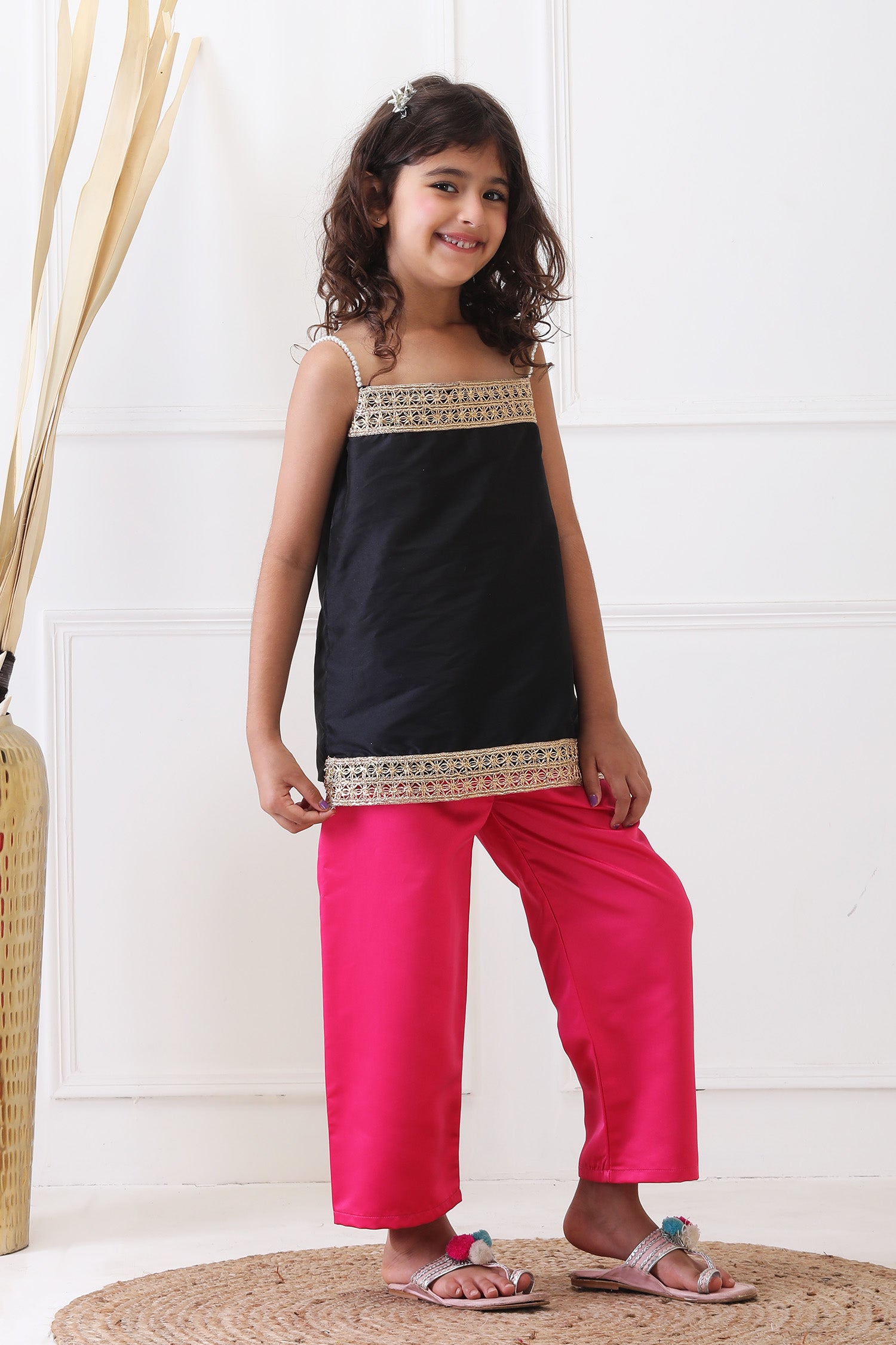Step into a world of charm with the Midnight Gulaab Lace Suit Set! This delightful ensemble combines delicate lace details with a vibrant rani pink & black hue, perfect for adding a splash of fun to any occasion.