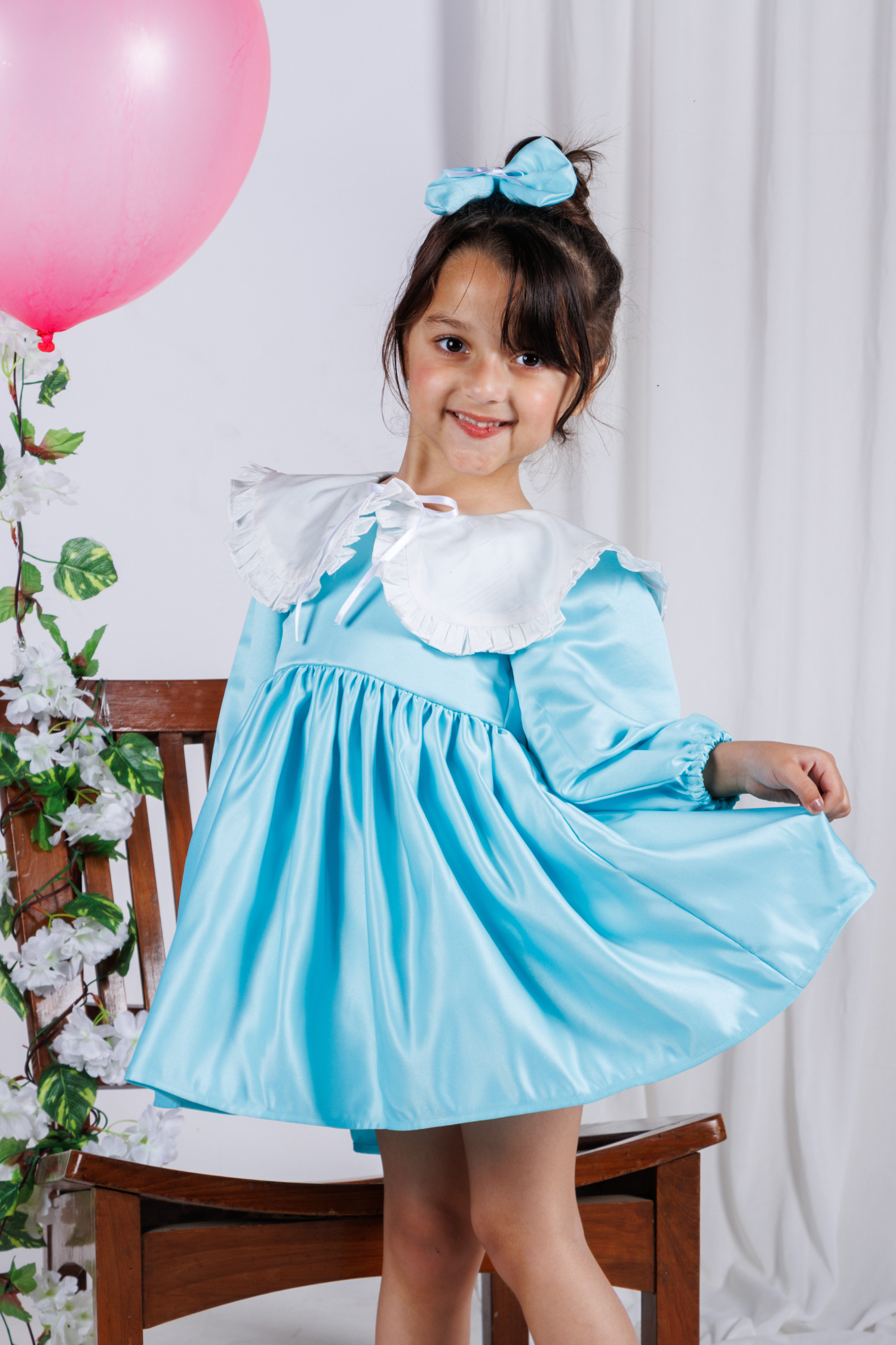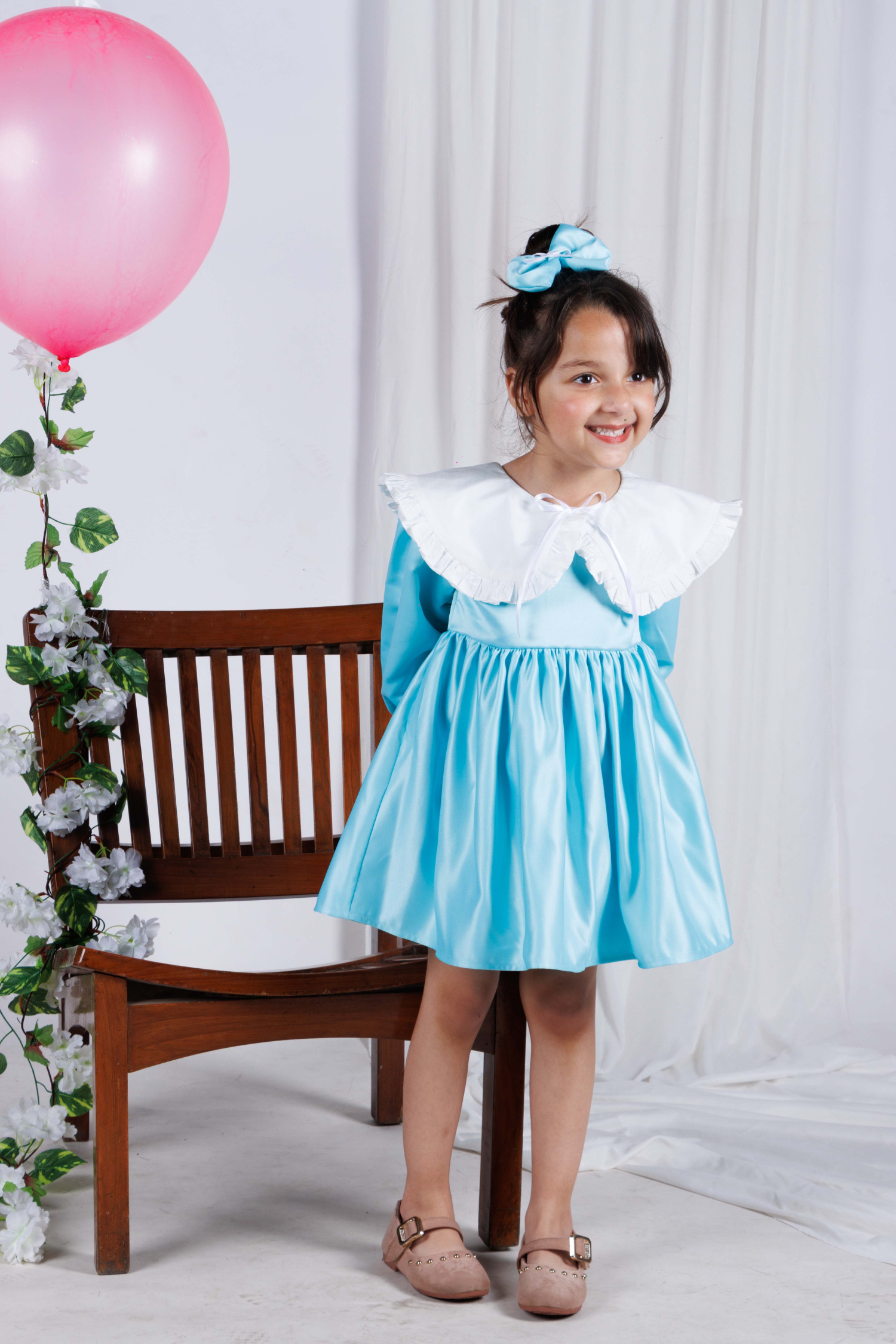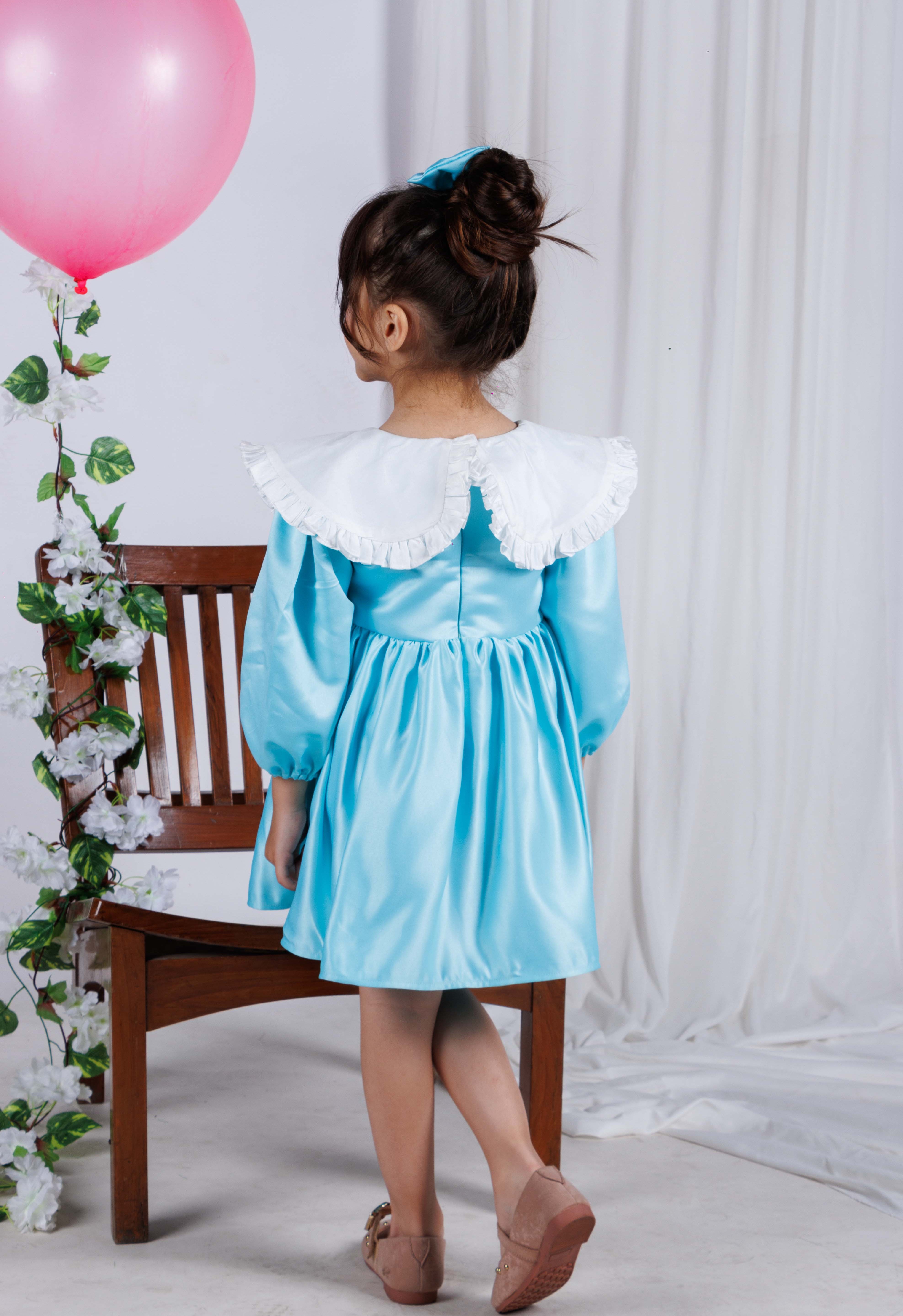- In a beautiful blue hue, this dress features a classic peter pan collar and playful silhouette.