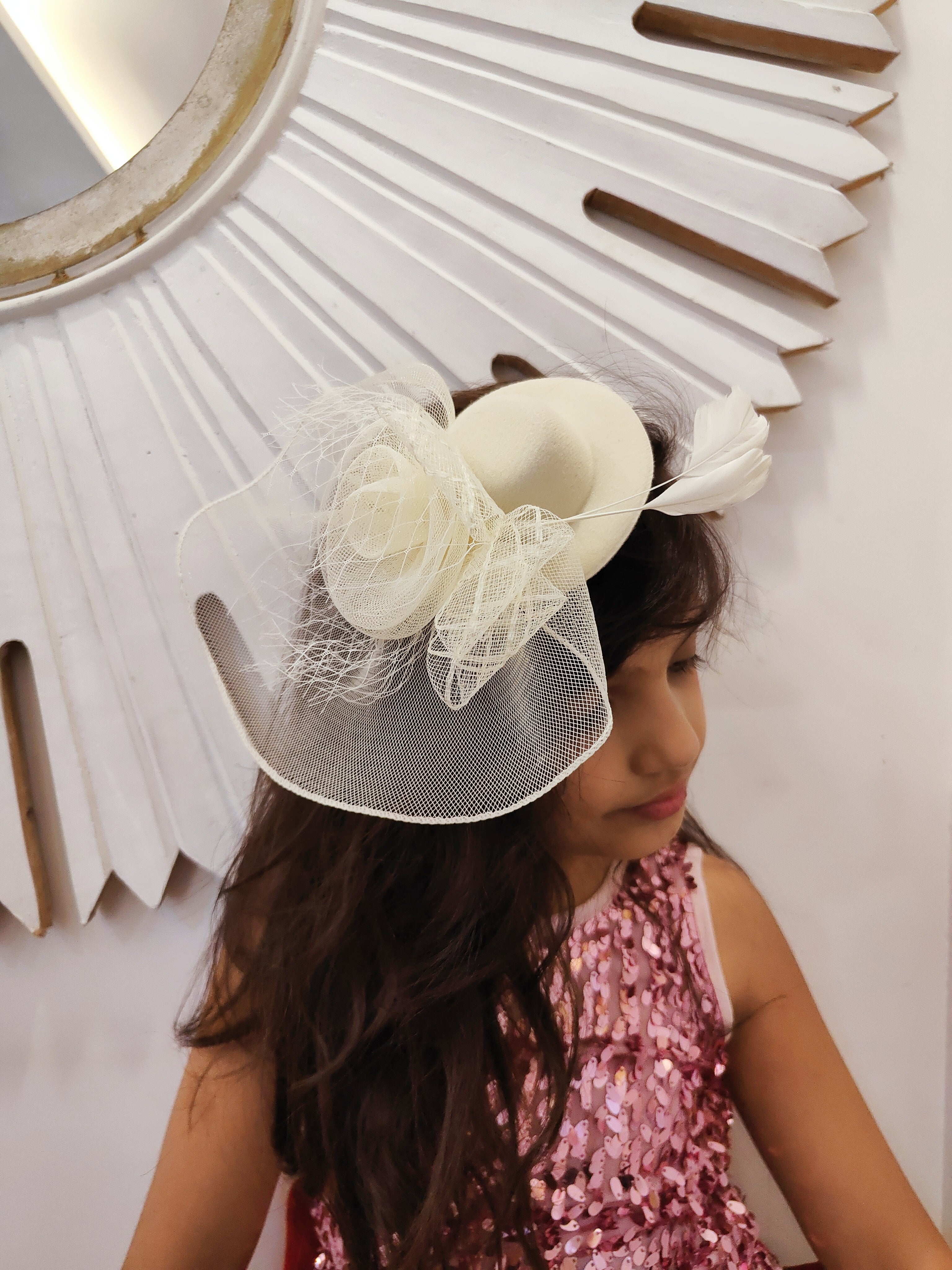 Elevate your style to new heights with this exquisite party hat style elegant ivory white colored luxury fascinator with a veil. This royal head piece is a true blend of modern design and luxury choice featuring statement wearing. Comes with a alligator clip attached for an easy wearing. It is just not fashionable but a total showstopper for the little diva.