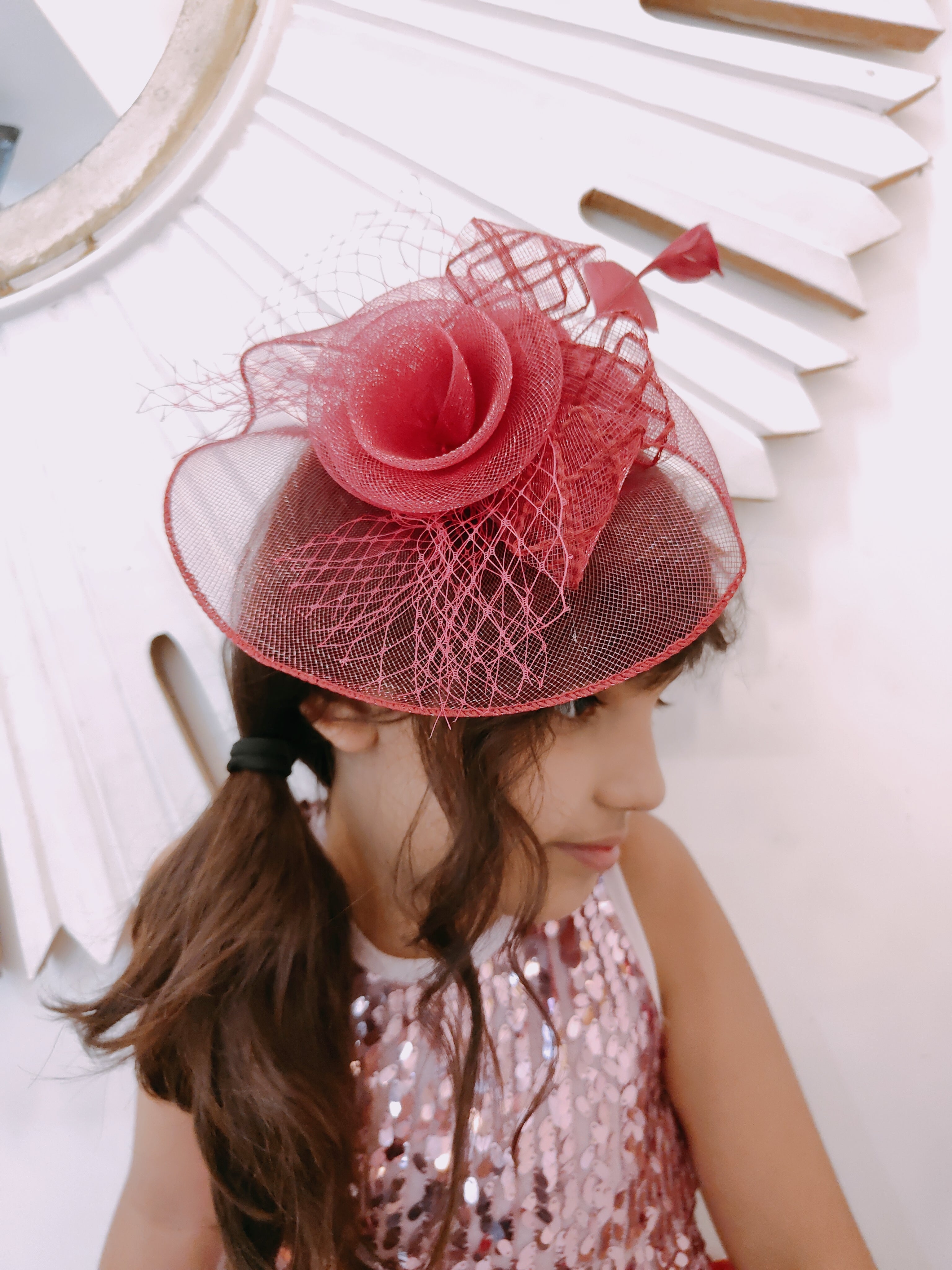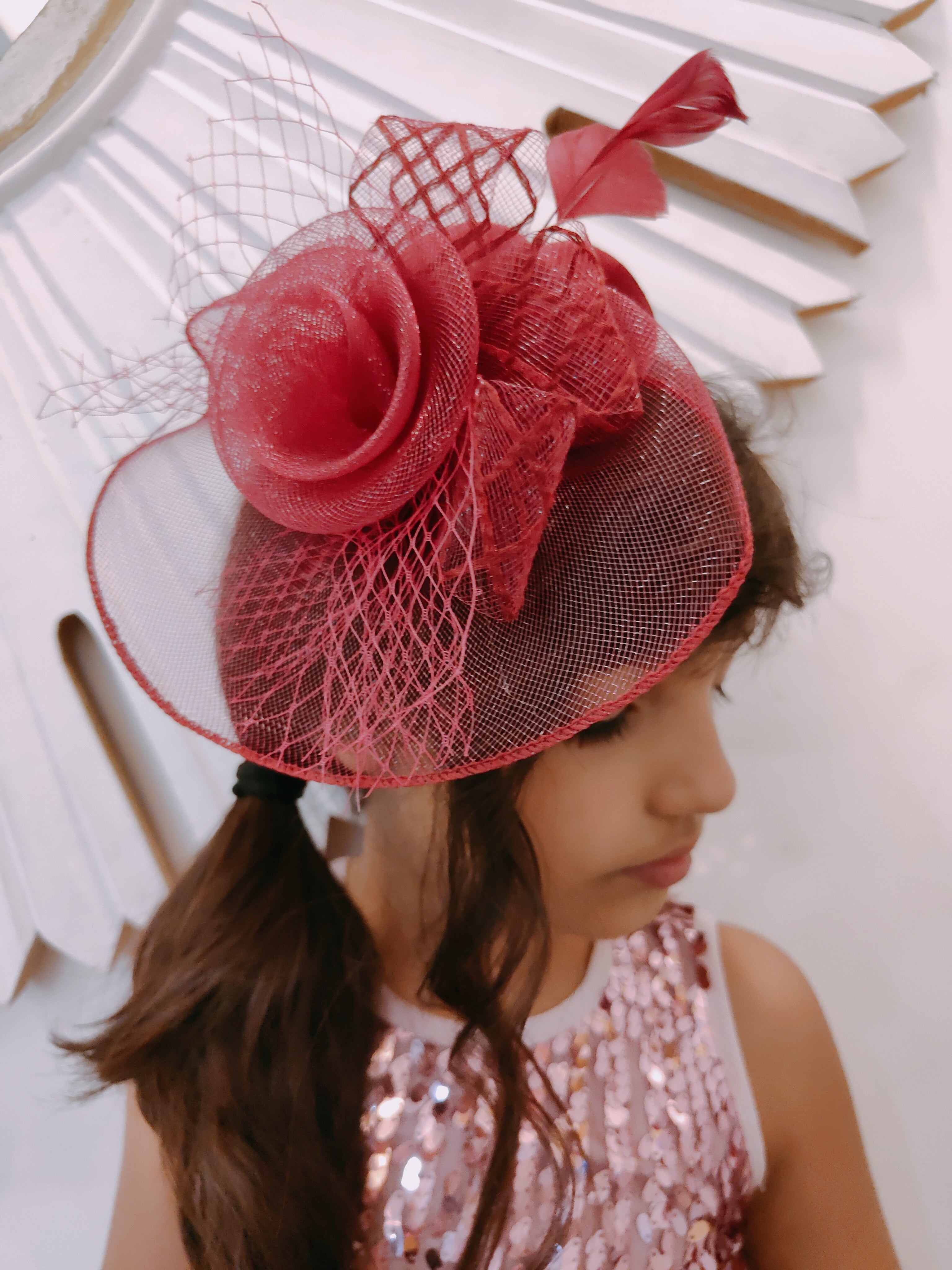 Elevate your style to new heights with this exquisite party hat style chic plum colored luxe fascinator with a veil. This royal head piece is a true blend of modern design and luxury choice featuring statement wearing. Comes with a alligator clip attached for an easy wearing. It is just not fashionable but a total showstopper for the little diva.