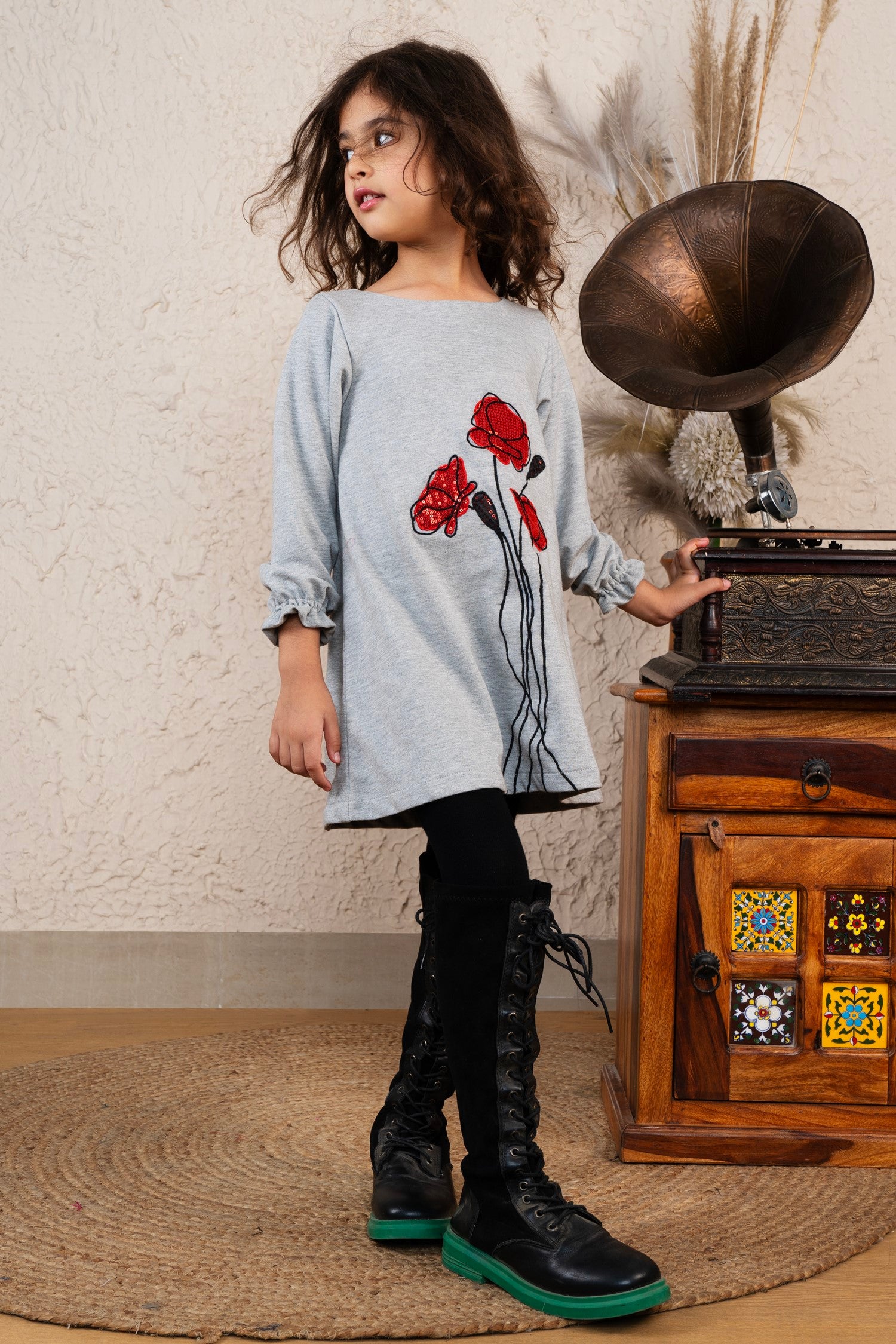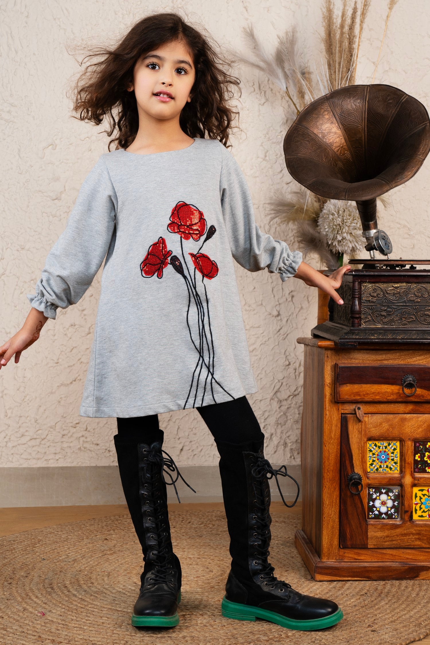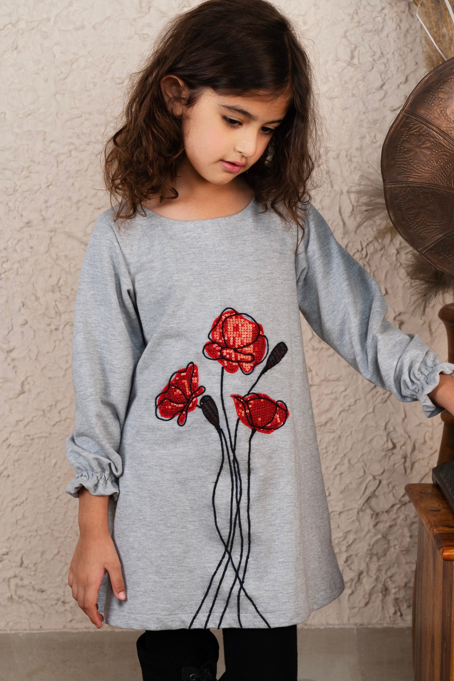 - This jersey dress features a playful pop of red flowers in the sequin center.