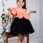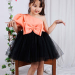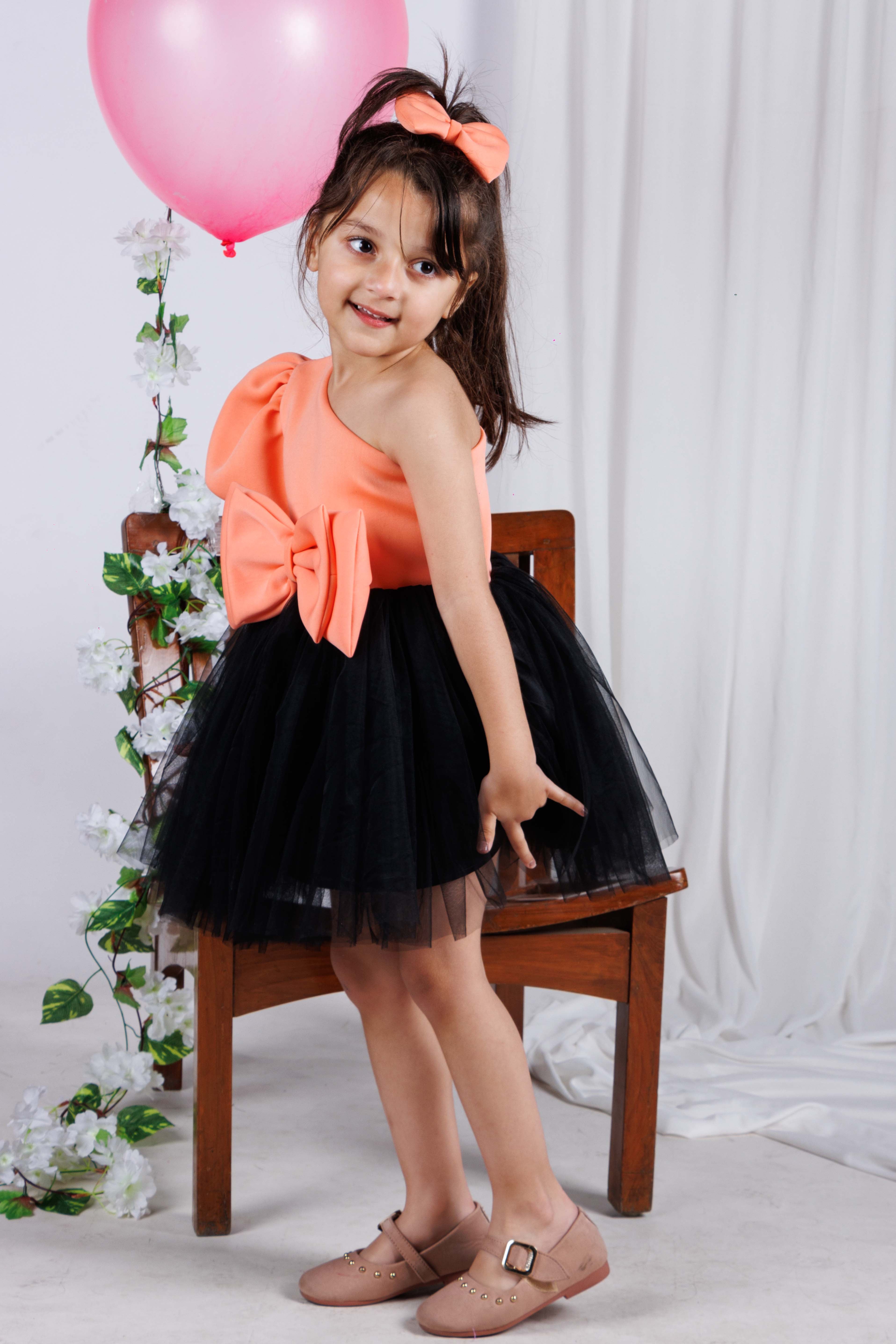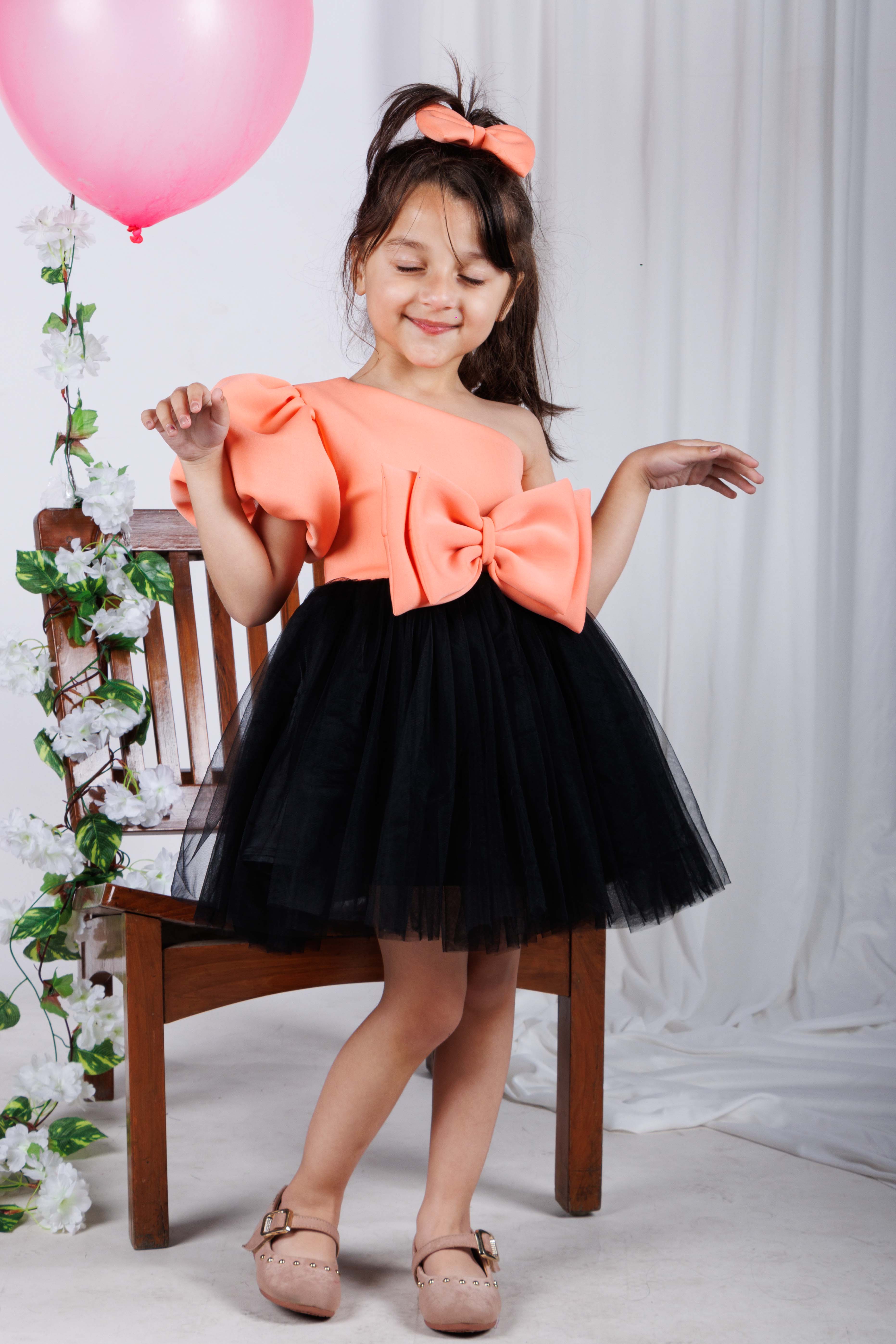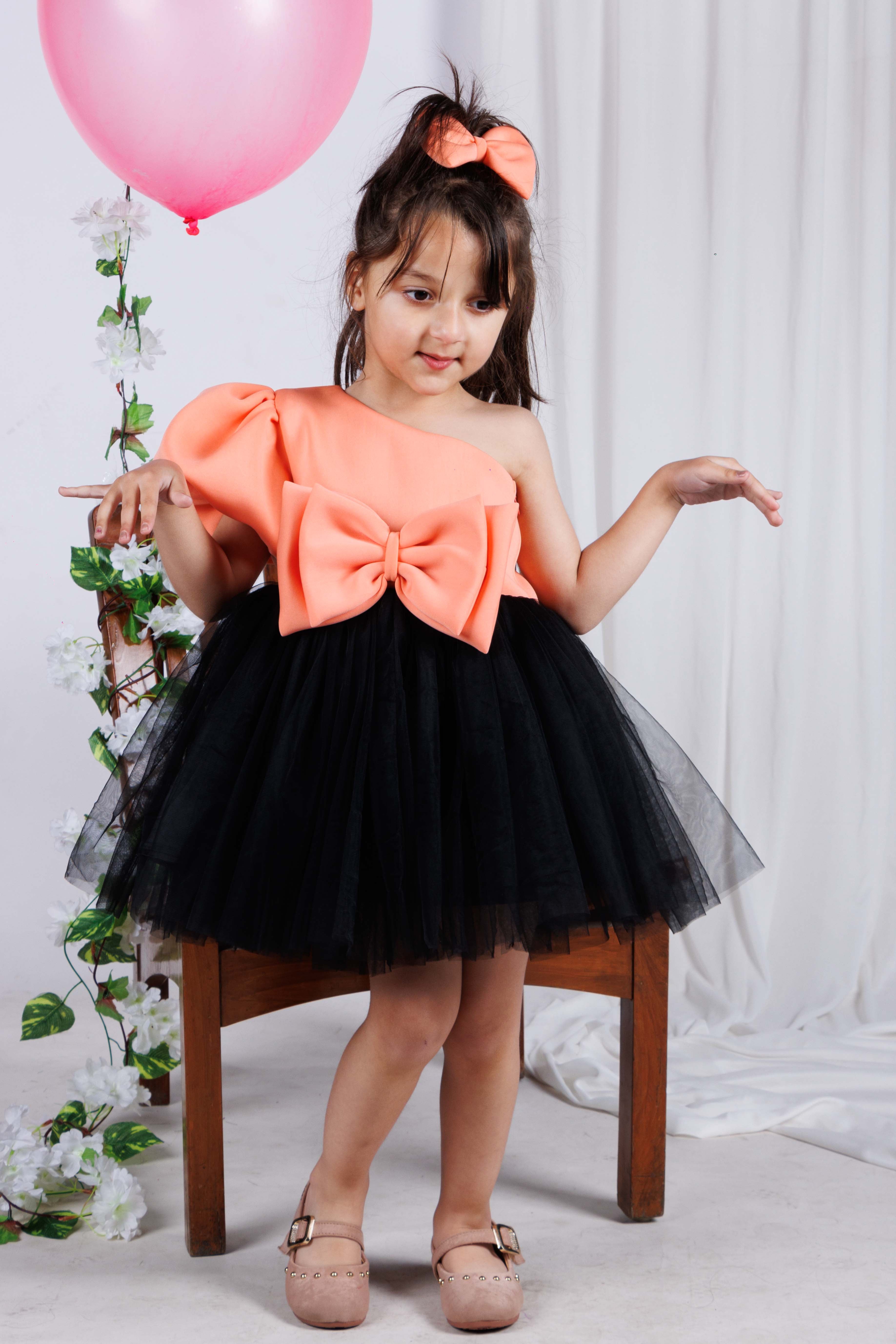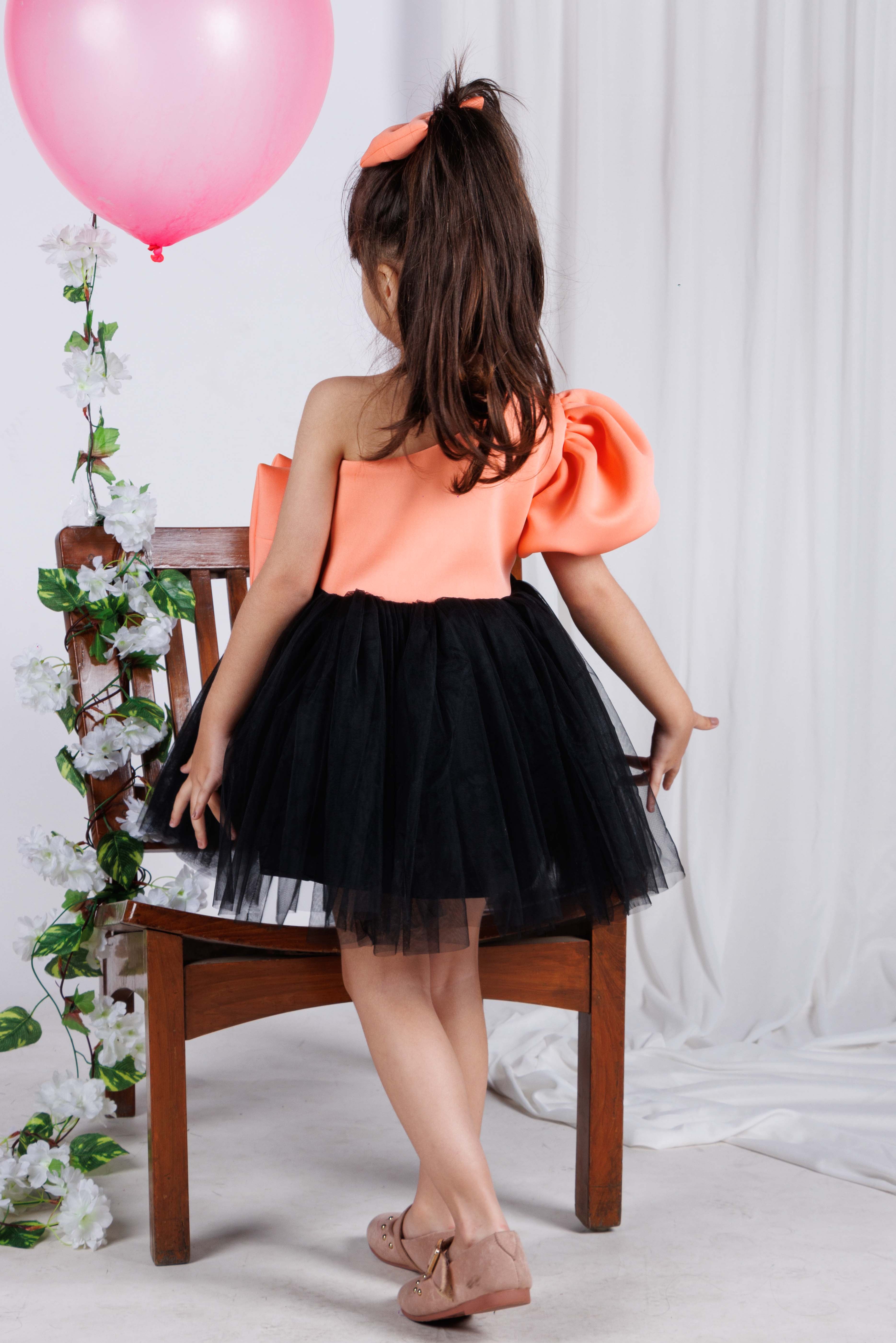 This cute one shoulder dress features delicate peach and black hues, with a charming bow accent in the front.