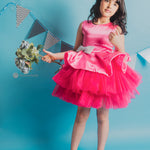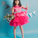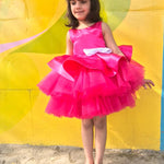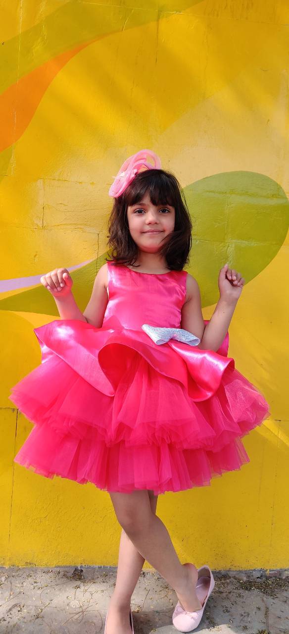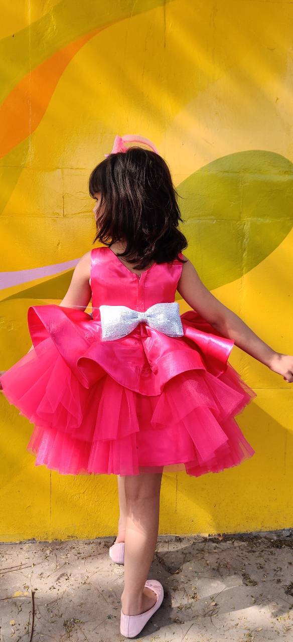 - Ballerina ruffle silhouette, a pink color ruffle frock with silver bow detailing , and ballerina fall make this pretty party dress a closet must-have.