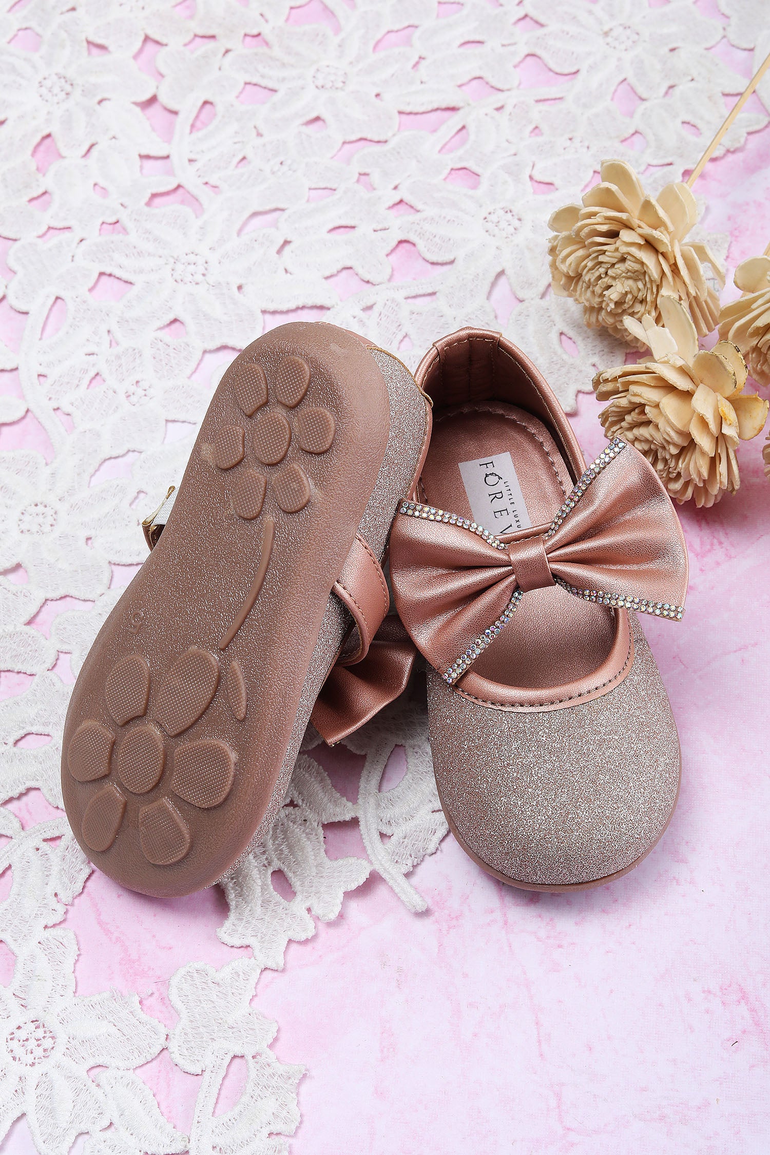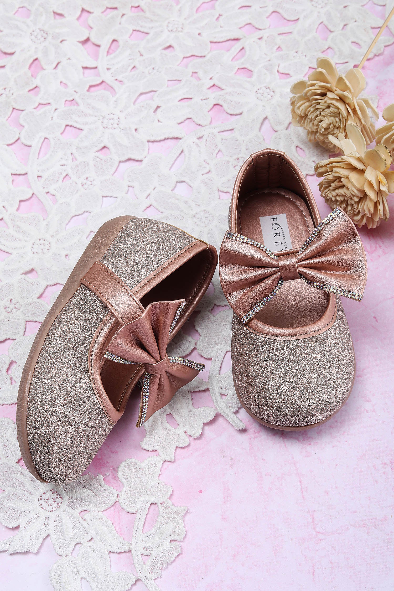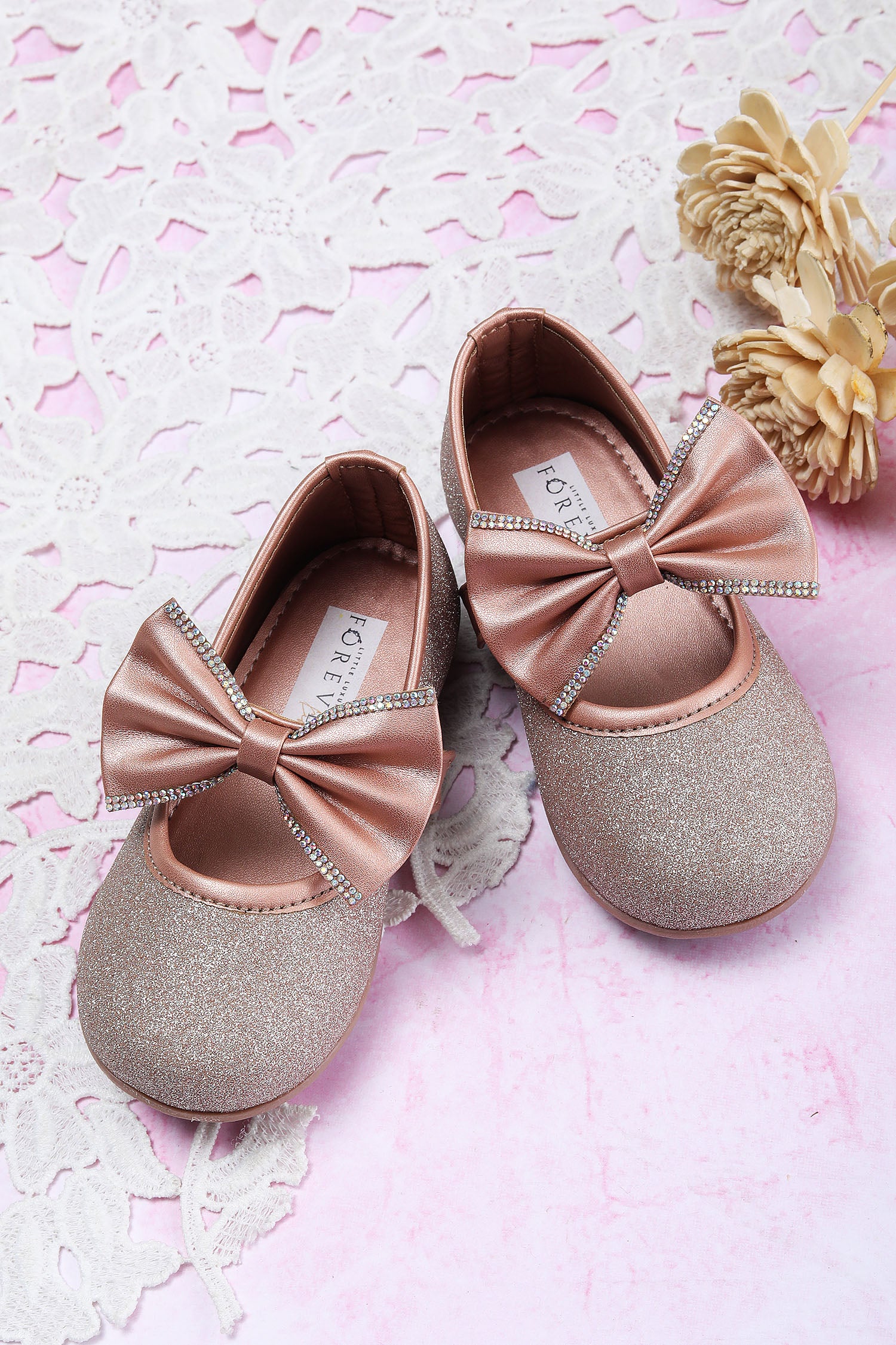 - Step into the perfect blend of style and comfort with the Rosy Glimmer Bow Ballerina.