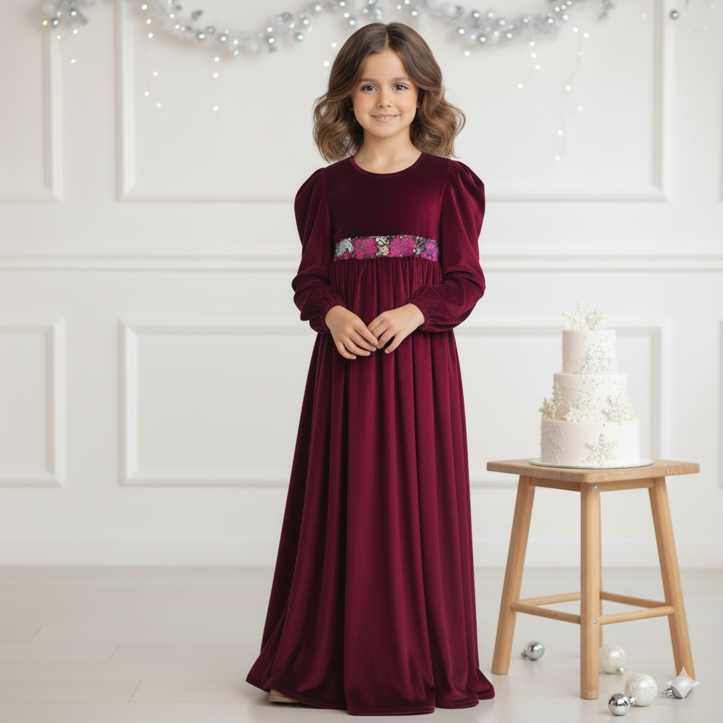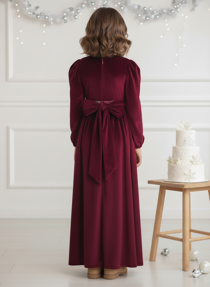 Elevate your child's special occasion wardrobe with this stunning Royal Plum Dreams Velvet Party Gown. Crafted from luxuriously soft velvet in a rich plum hue, this gown exudes timeless elegance and refined charm.