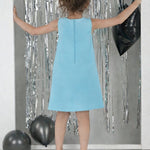 - This dress features a unique shimmer material and a playful bow detail, making it perfect for any special occasion.