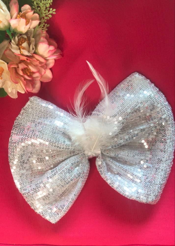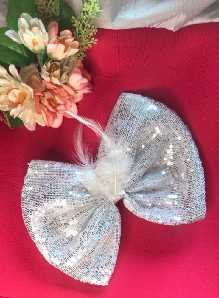 Silver glittering Sequin head bow with a tic tac clip. Bow is also adorned with feather, goes best with most of the outfits.