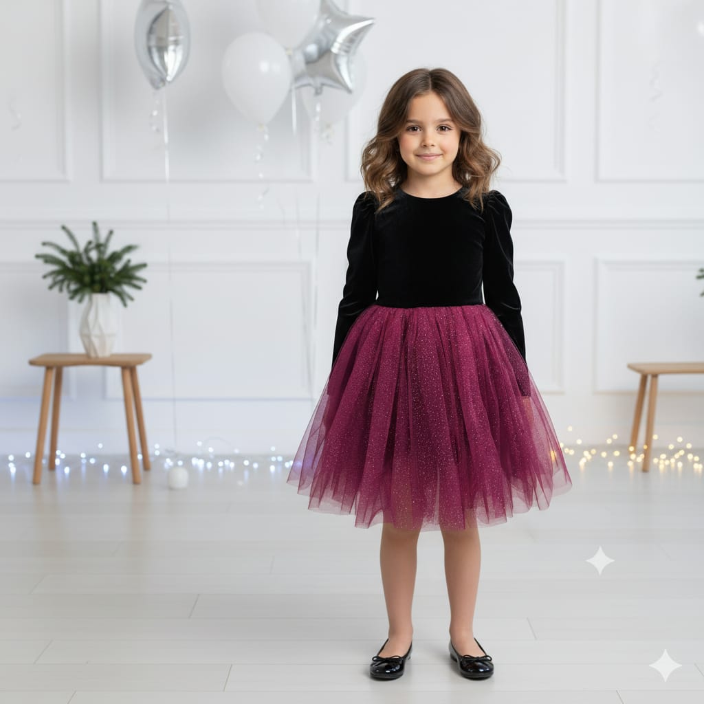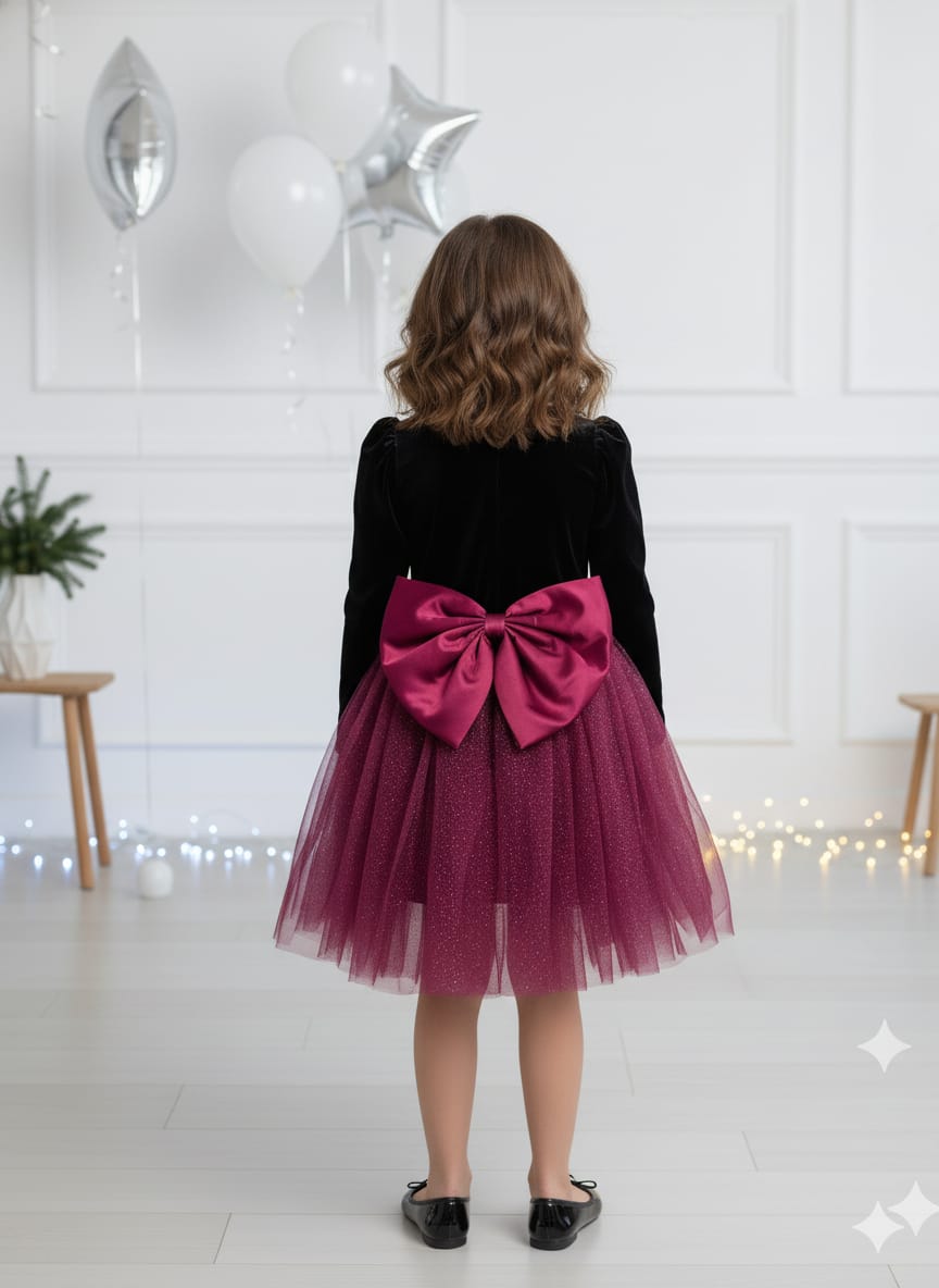 Rendered in plush velvet with a subtle shimmer finish, the twilight plum tone exudes refined elegance and depth. The dress features a graceful silhouette designed to celebrate youthful beauty while maintaining impeccable sophistication. Perfect for festive gatherings, milestone celebrations, and formal events, this piece combines luxurious fabric with timeless appeal.