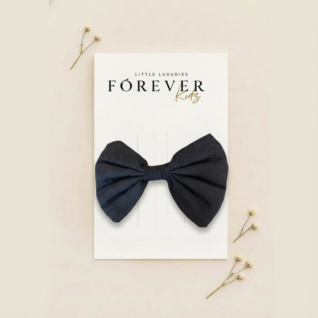 - Elevate your child's accessory collection with this charming Denim Bunny Bow Clip. Crafted with meticulous attention to detail, this whimsical piece combines playful design with refined craftsmanship.